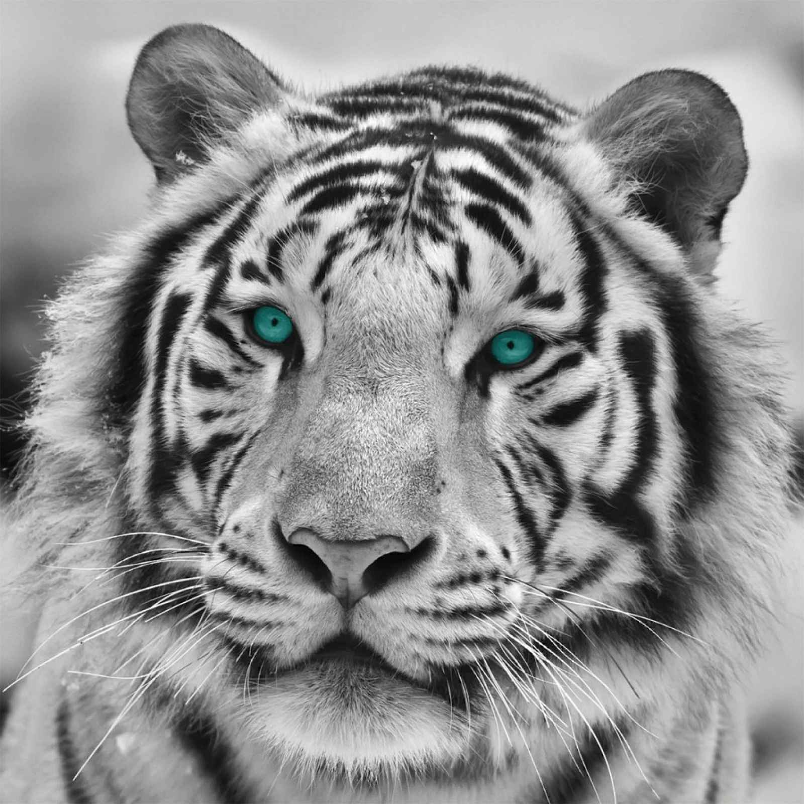 Čtvercový obraz na zeď s motivem tygra s výraznýma tyrkysovýma očima perfektně doladí atmosféru interiéru. Černobílý obraz o rozměru 35x35 cm. - obraz na zeď - provedení obrazu: tištěný na plátně - barva: šedá - motiv: tygr - rozměry: 35x35 cm - způsob umístění: zadní zavěšení na zeď - využití: nástěnná dekorace do interiéru - moderní styl
