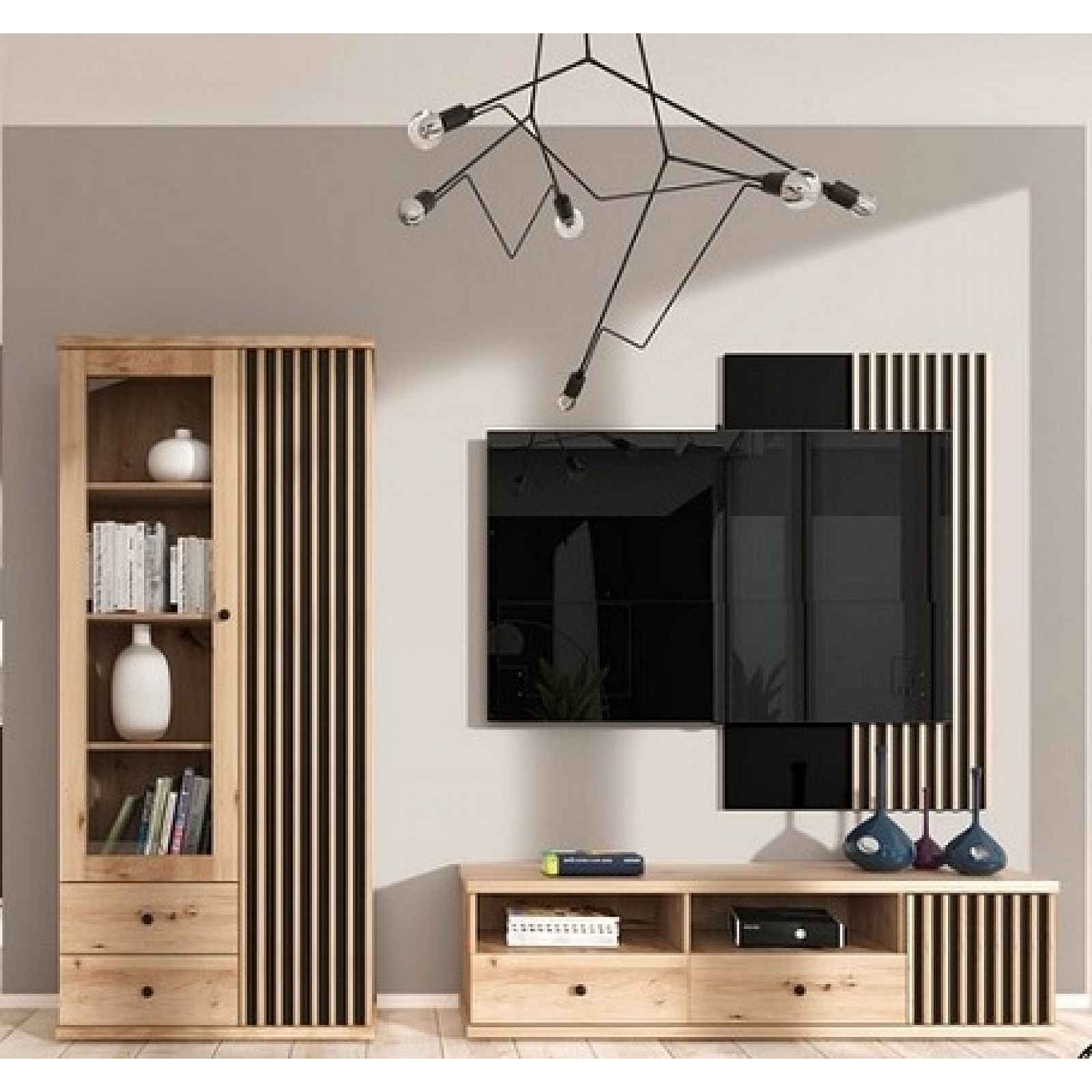 Obývací stěna ze sektorové řadyUvádíme pouze jako příklad. Jednotlivé segmenty je možné zakoupit každý zvláště a vytvořit si tak sestavu dle vlastních požadavků.Sestava se skládá z:- dekorační závěsný panel (šxvxh): 80 x 138 x 3,2 cmTelevizní stolek1D2S (šxvxh): 160,6 x 43,4 x 40,6 cm- vitrína 2D2S (šxvxh): 86,4 x 201 x 40,6 cmBarva: dub artisan/černáMateriál: kvalitní lamino s ABS hranami/lamely jsou vyrobeny z desky MDFDodáváno v demontu