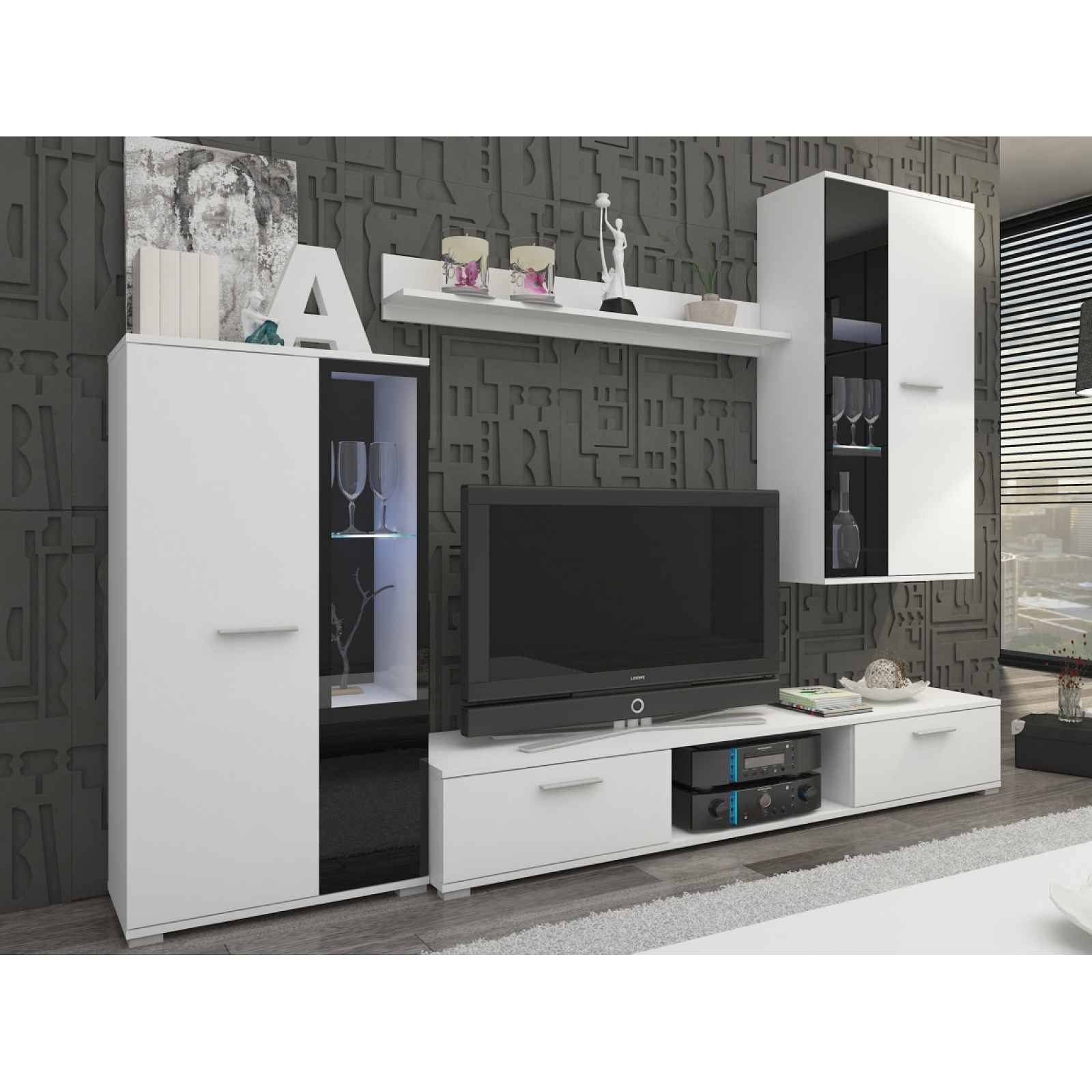 Obývací stěna v neutrálním bílém provedení s částečnými černými prvky Barevné provedení: bílé Sestava se skládá z (rozměry šxvxh): * TV stolek s výklopy (176 x 30 x 40,2 cm) * Vitrína (59,3 x 115 x 30,6 cm) * Vitrína na zavěšení (59,3 x 113 x 30,6 cm) * Police (102 x 16 x 17 cm) Materiál: lamino LED osvětlení není v ceně. Dodáváme v demontu. Záruka 24 měsíců.