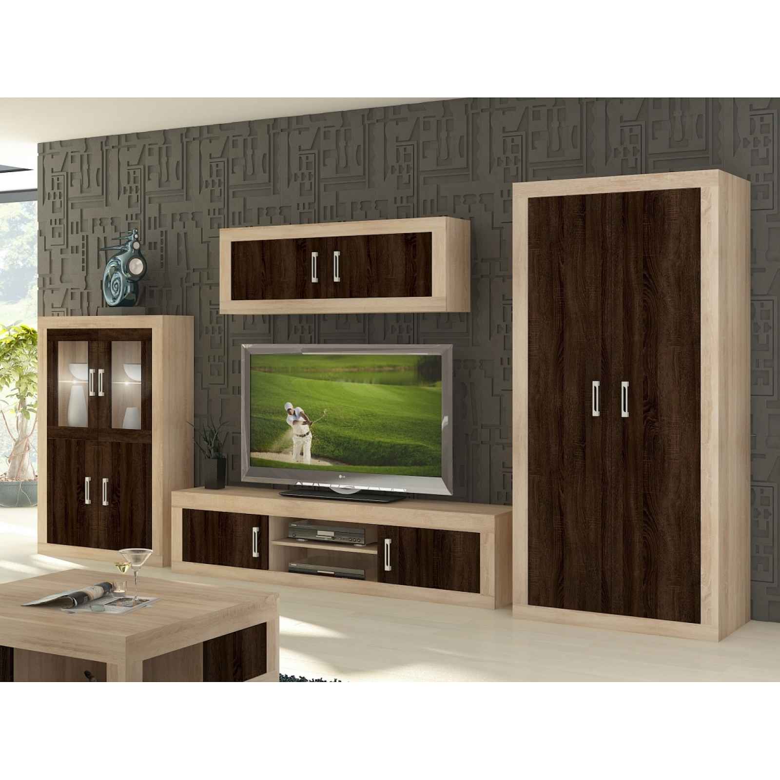 Obývací stěna Barva: dub sonoma/dub sonoma tmavý Materiál: lamino 16 mm Součástí obývací stěny je (rozměry šxvxhl): * závěsná skříňka (130 x 46 x 34 cm) * skříň (90 x 198 x 60 cm) * regál (90 x 141 x 34 cm) * RTV stolek (180 x 44 x 44 cm) Stříbrné úchytky zásuvek a dvířek jsou vyrobeny z tvrzeného PVC. Dodává se v demontu. Záruka 5 let.