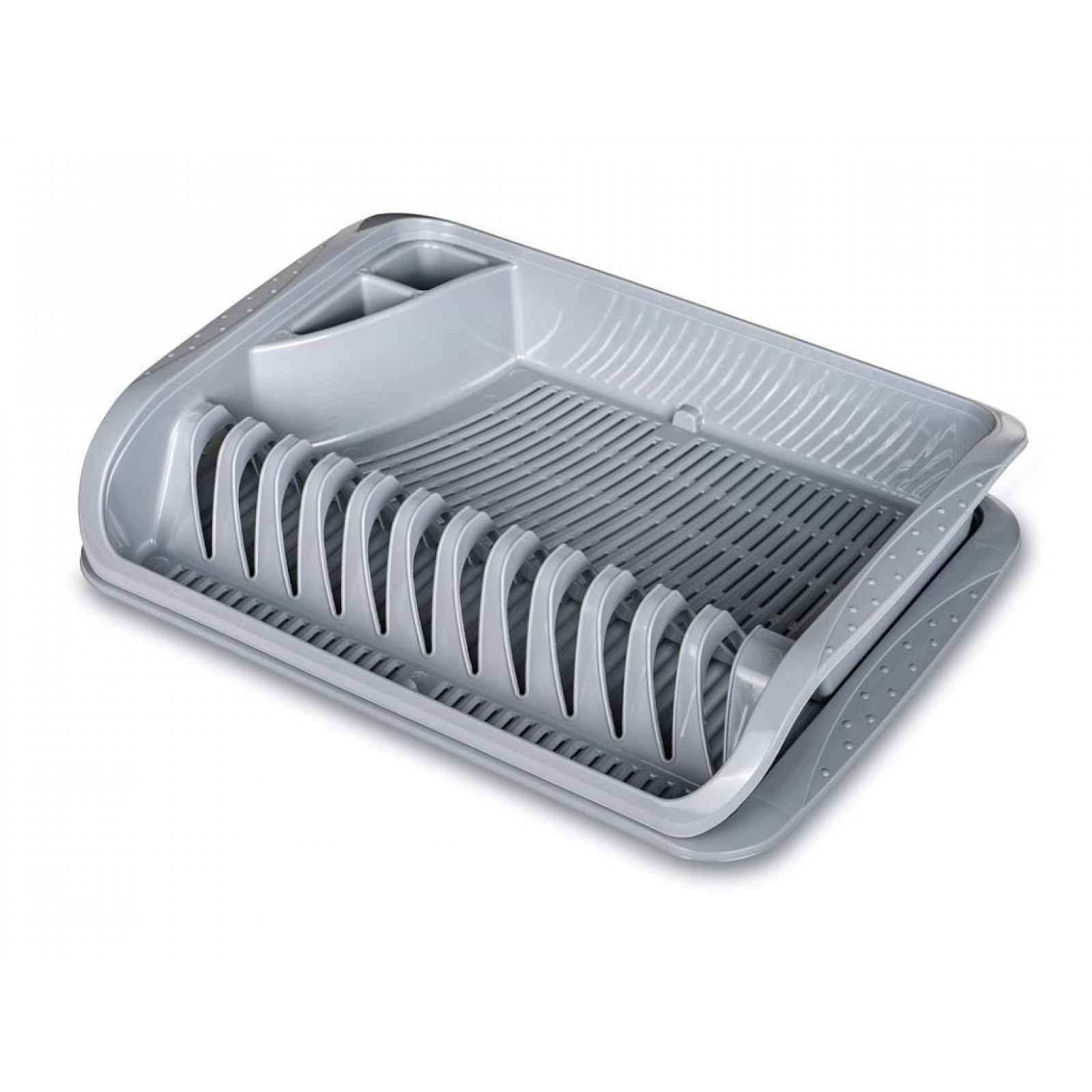 Odkapávač 39,5x29,5x8 cm v šedé barvě je praktický pomocník do kuchyně, který zjednoduší sušení nádobí a pomůže udržet pracovní plochu suchou a organizovanou. Odkapávač myKITCHEN s táckem na vodu v šedé barvě je praktický pomocník do kuchyně, který zjednoduší sušení nádobí a pomůže udržet pracovní plochu suchou a organizovanou. Díky chytrému rozdělení na sekce pro příbory, talíře a ostatní nádobí budete mít vše vždy dokonale uspořádané. Rozměr 39,5x29,5x8 cm. - materiál: plast - barva: šedá - 1 x praktická miska na vodu - 2 x přihrádka na příbor - 3 sekce: na příbory, talíře a ostatní nádobí - pro umístění až 12 talířů - tácek s mírně vyvýšeným okrajem zabraňuje vylití vody a umožňuje udržovat čistotu - určeno pro odkládání umytého nádobí - lze mýt v myčce nádobí - rozměr: 39,5x29,5x8 cm