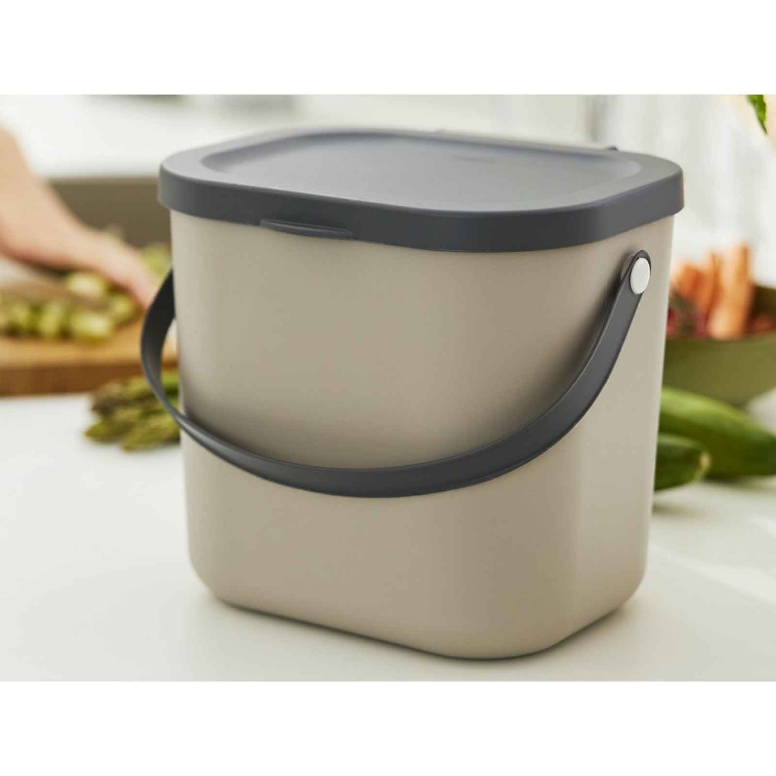 Malý odpadkový koš o objemu 6 litrů v barvě cappuccino je praktický pomocník do každé kuchyně nebo koupelny. Koš má víko a pohodlnou rukojeť umožňující snadné přenášení. Lze snadno kombinovat se všemi ostatními velikostmi řady ALBULA. - koš na odpad - vnitřní objem: cca 6 l - rozměr: 20x20,8x23,5 cm - materiál: recyklovaný plast - barva: béžová cappuccino/antracitová - víko lze zcela otevřít - při zavřeném víku neunikají žádné pachy - praktické ucho pro snadný přenos - ideální pro drobné odpadky, vhodné do kuchyně, koupelny, kanceláře - lze použít i na kompost, organický odpad, ale také na ukládání suchých potravin a dalších věcí - ideální pro malé domácnosti - snadné a rychlé vyprazdňování odpadků - snadné čištění, lze mýt i v myčce na nádobí - lze kombinovat s ostatními velikostmi řady Albula (stohovatelné do sebe)
