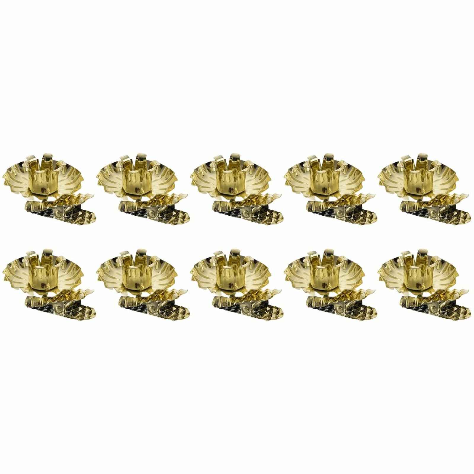 Sada 10 kusů kovových skřipců vám umožní umístit i klasické voskové svíčky na větvičky vánočního stromečku. Svíčku snadno připevníte do středu držáku o průměru 1,5 cm, velikost lze lehce upravit stisknutím jednotlivých kovových jazýčků tak, aby v něm svíčka držela pevně. Pak již stačí stisknout skřipec/kolíček s pružinkou a umístit na vybrané místo. Hodí se na větvičky s tloušťkou max. 1 cm. Držáky jsou vyrobeny ze železného plechu.Vždy dbejte na bezpečné umístění svíček tak, aby horní větve nebyly příliš blízko plamene. Nenechávejte svíčky nikdy bez dozoru.
