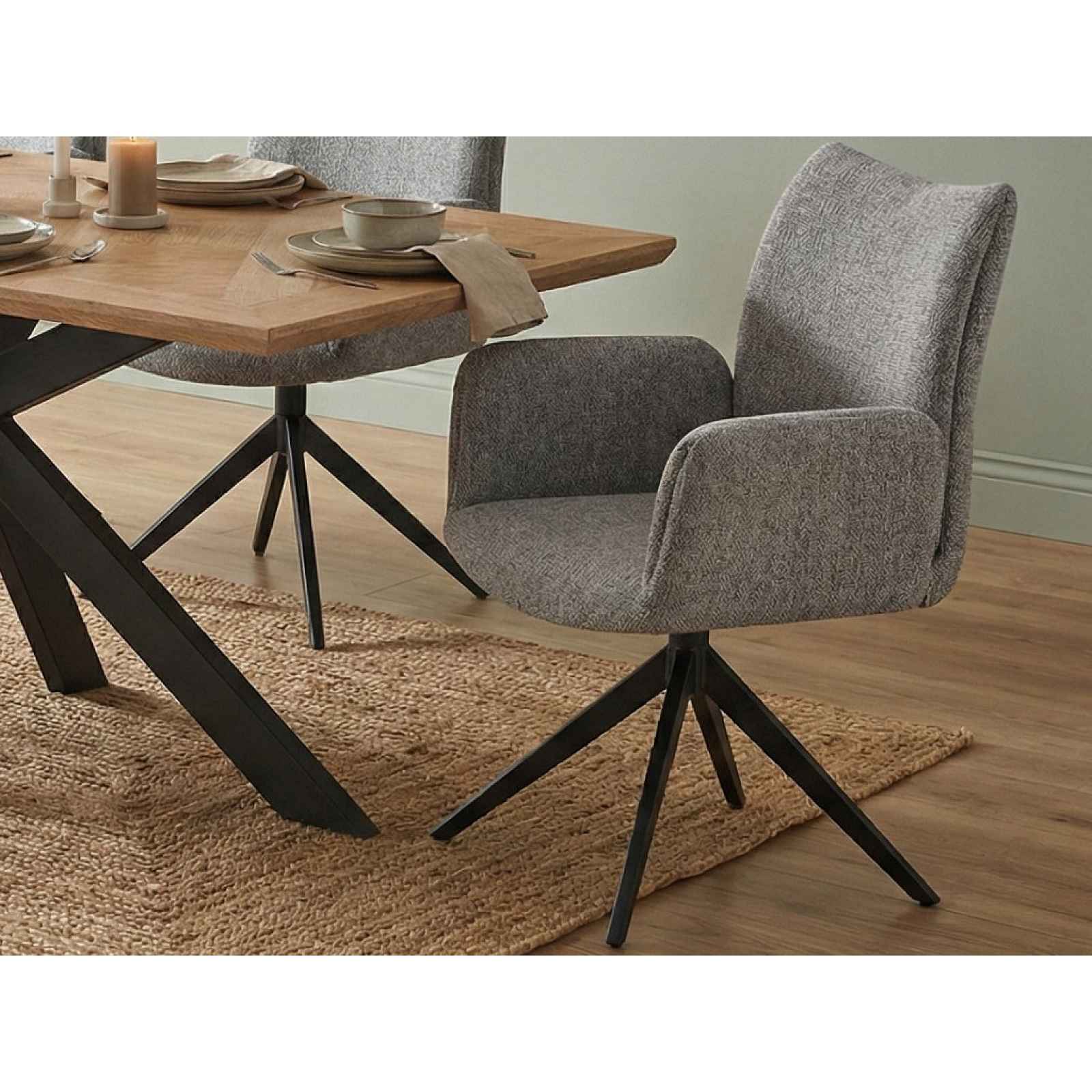 Židle s područkami v elegantním moderním stylu má pohodlně zaoblené opěradlo, otočný sedák a černou kovovou podnož. Očalouněna tkaninou v barvě holubí šedá. Jídelní židle s područkami v elegantním moderním stylu má pohodlně zaoblené opěradlo, otočný sedák a černou kovovou podnož. Očalouněna tkaninou v barvě holubí šedá. Židle se bude dokonale hodit do moderně zařízené jídelny, kde vynikne. - konstrukce: kov, dřevovláknitá deska - podnož/nohy: kov, kónický tvar, hranatý profil - povrchová úprava: černý lak - polstrovaný sedák/opěrák (polyuretanová výplň) - potah sedák/opěradlo: látka Brego 07 - jemně strukturovaná tkanina, barva holubí šedá (složení: 100% PES, otěruvzdornost: 30.000 cyklů) - okrasný zádový zip - sedák: středně měkký - opěrák: zaoblený tvar = komfortní + opora bederní oblasti - sedák otočný o 360° - boční područky - výška sedu: 48 cm - hloubka sedu: 45 cm - šířka sedu: 45 cm - výška opěradla: 43 cm - výška područky: 67 cm - moderní elegantní styl - stabilní - doporučená nosnost do 120 kg - dodáváno v demontu