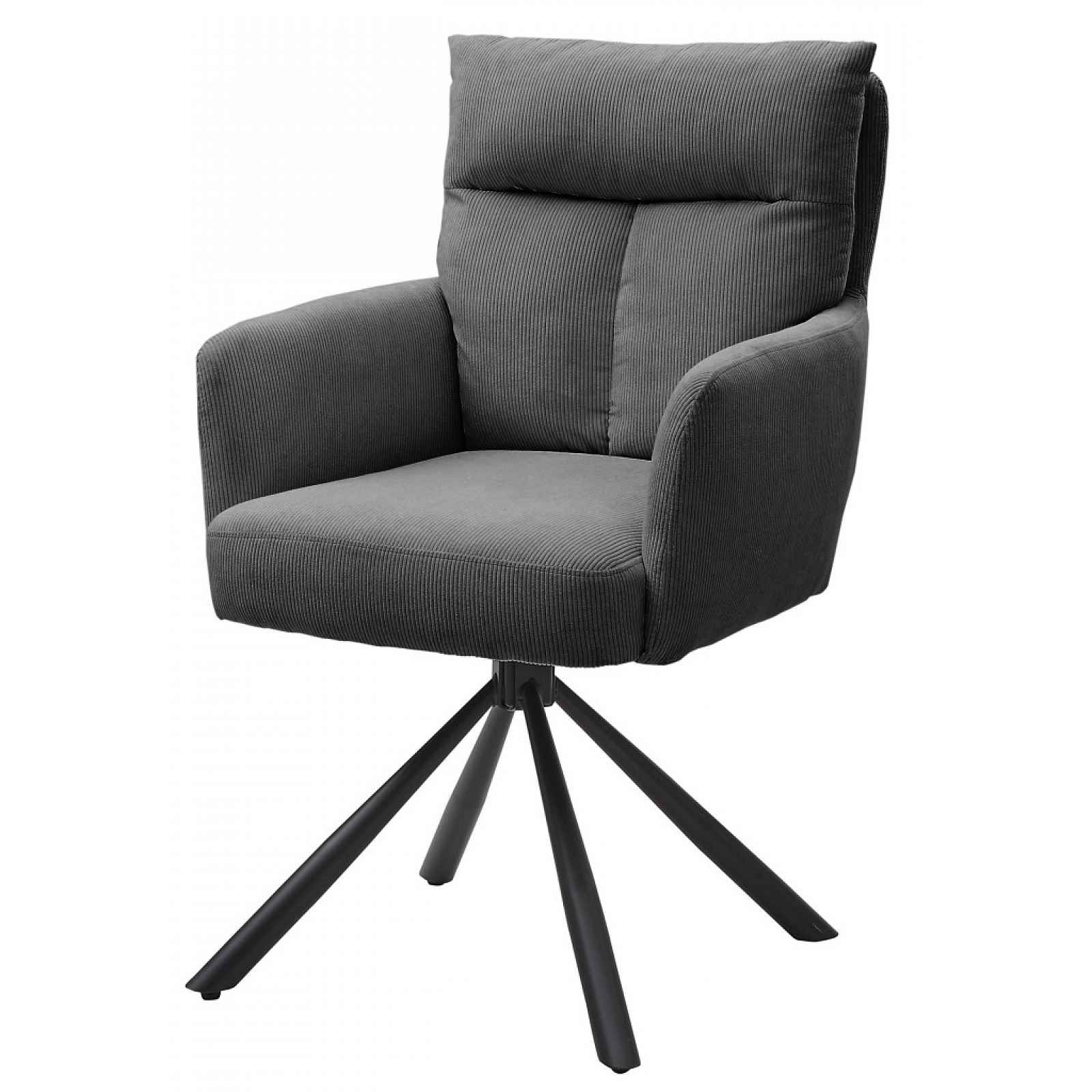 Luxusní jídelní židle má komfortně měkkoučké pružinové sezení a elegantní design v polštářové optice. Sedák židle je otočný a kovové nohy poskytují stabilitu. Luxusní jídelní židle má komfortně měkkoučké pružinové sezení a elegantní design v polštářové optice. Sedák židle je otočný o 180° a černá kovová podnož v kónickém tvaru poskytuje stabilitu. Židle je očalouněna měkkou strukturovanou látkou v barvě šedá, která dotváří útulnou atmosféru v prostoru jídelny. Tato židle dokonale vynikne v moderním prostoru jídelny. - konstrukce: kov, dřevovláknitá deska - podnož/nohy: kov, kónický tvar, zaoblený profil - povrchová úprava: černý matný lak - jádro sedáku: pružiny - polstrovaný sedák/opěrák (polyuretanová výplň) - potah: látka Cord - měkoučká látka s jemnou proužkovanou strukturou, barva šedá (složení: 100% polyester) - sedák: komfortně měkký - opěrák: polštářová optika, komfortně měkký - sedák otočný o 180° - boční područky - výška sedu: 48 cm - moderní elegantní design - stabilní - doporučená nosnost do 120 kg - dodáváno v demontu