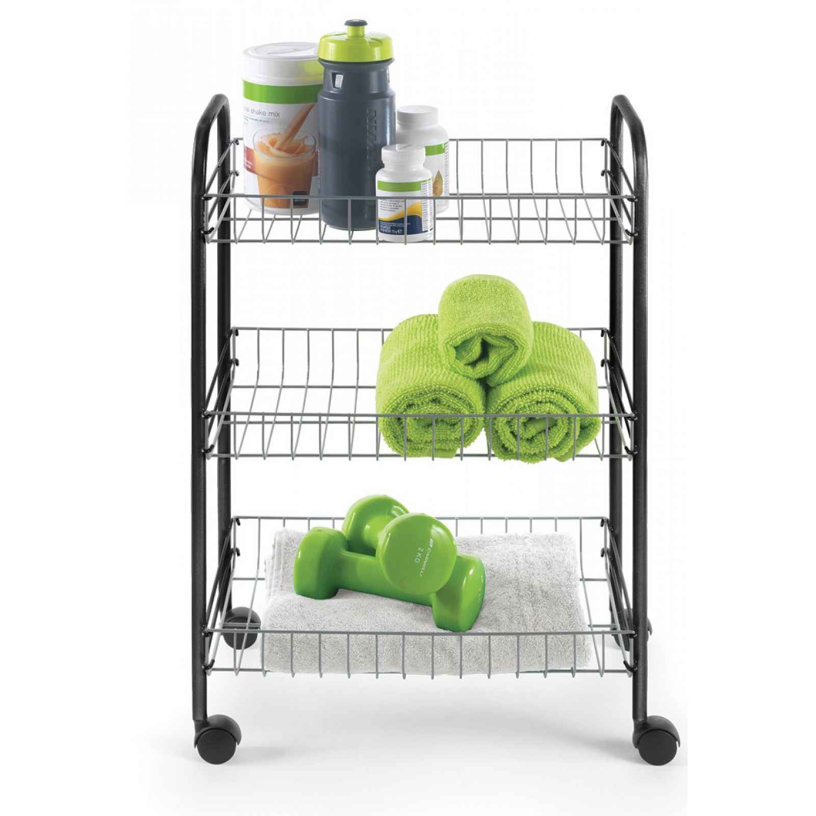 Univerzální pojízdný regál se 3 košíky je praktickým řešením pro rozšíření úložného prostoru nejen v kuchyni. Lze také využít jako servírovací stolek. Univerzální pojízdný regál se 3 košíky je praktickým řešením pro rozšíření úložného prostoru nejen v kuchyni. Víceúčelový vozík na kolečkách lze využít jako servírovací stolek, ale také nabízí dostatek místa pro koupelnové potřeby, čistící prostředky nebo kancelářské doplňky. Povrchová úprava kovová šedá/černá. - třípatrový pojízdný vozík s košíky do kuchyně, koupelny, kanceláře - materiál: kov, dráty potažené tenkou plastovou vrstvou - povrchová úprava: matná černá, kovová šedá alu - rozměr: 23x61x41 cm - 3 x prostorný košík pro přehledné uložení věcí - 4 x 360° otočná kolečka pro snadnou manipulaci - ideální na různé kuchyňské potřeby, ovoce, zeleninu, čistící prostředky, koupelnové doplňky, kancelářské potřeby - úspora místa díky vertikálnímu systému skladování - dodáváno v demontu