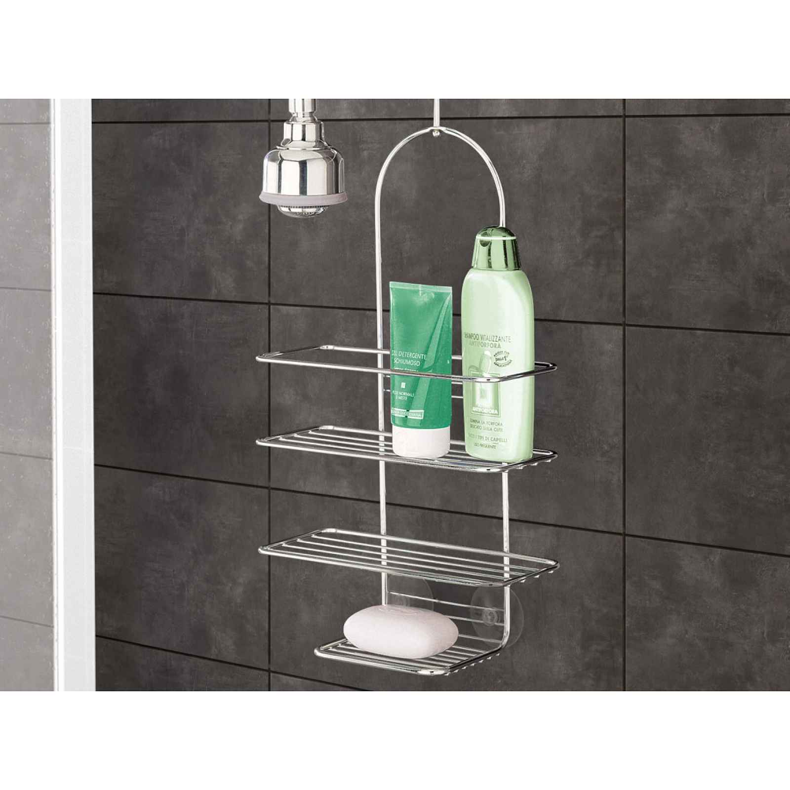Třípatrová závěsná police s antikorozní chromovou úpravou do sprchy je ideálním řešením pro každého, kdo hledá pořádek v koupelně bez nutnosti vrtání. Třípatrová závěsná police do sprchového koutu je ideálním řešením pro každého, kdo hledá pořádek v koupelně bez nutnosti vrtání do obkladů. Regál nabízí dostatečný prostor pro veškerou vaši kosmetiku od šamponů až po mýdla. Exkluzivní povrchová úprava chrometherm je antistatická, odolná vůči rzi a snadno se udržuje. - materiál: kov - povrchová úprava: lesklá chromovaná antikorozní povrchová úprava - výška: 43 cm (53 cm i s hákem) - 3 x polička - 1 x otočný háček pro zavěšení - 2 x přísavky součástí balení - snadná montáž bez vrtání
