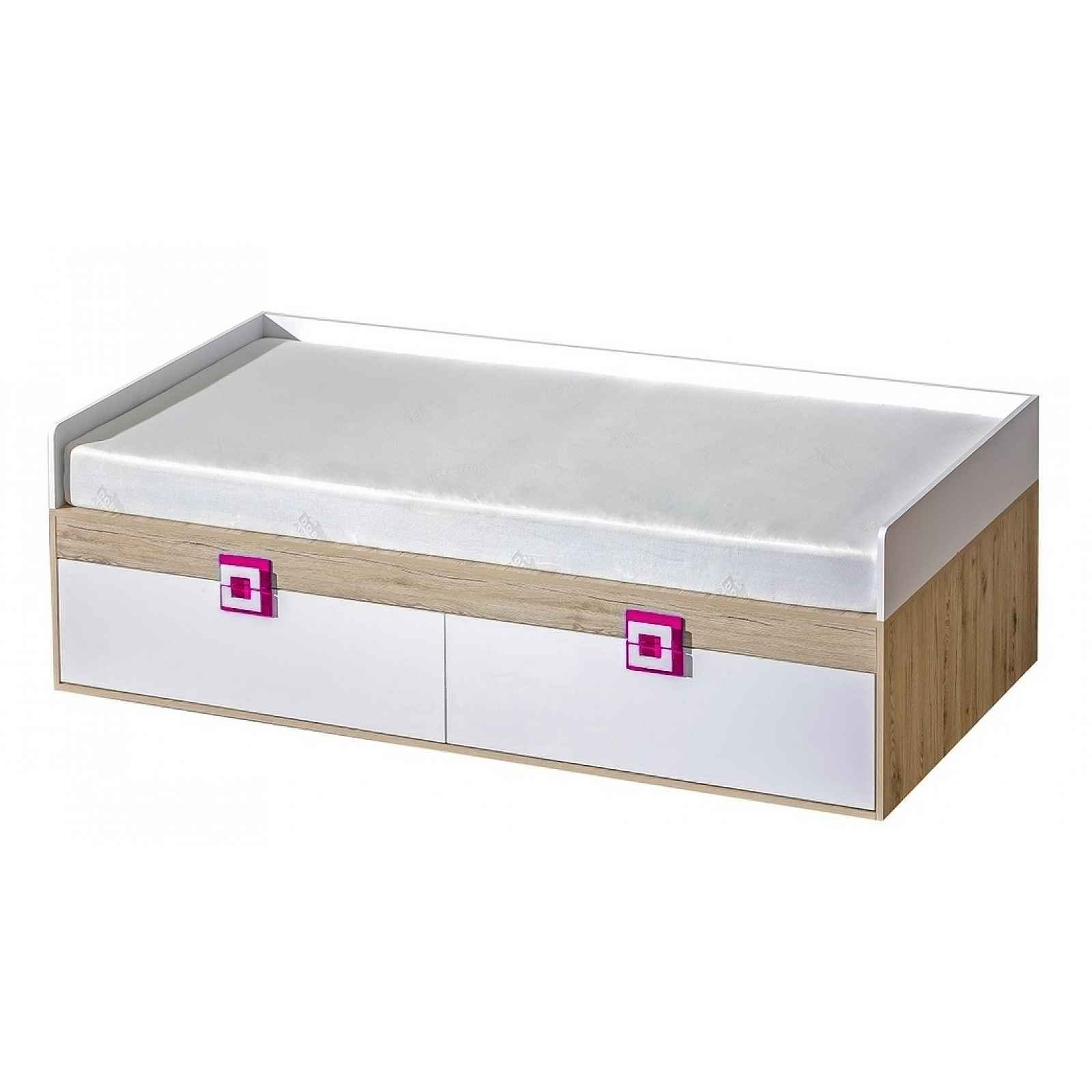 Postel, 90x200 cm, dub jasný/bílá/růžová.Postel s roštem a úložným prostorem ze sektorové řady, která se vyznačuje netradičním zpracováním barev a originalitou úchytů. Rošt je v ceně, matraci je třeba doobjednat, vhodný rozměr 90 x 200 cm. Tento styl nábytku zaujme každou mladší generaci. Postel je vyrobena z kvalitní LTD desky hraněné ABS lištou. Korpus je v barvě dub jasný, čela zásuvek jsou v barvě bílá mat. Úchytky jsou v barevné kombinaci růžová / bílá. Součástí postele jsou dvě zásuvky ve spodní části. Tento sektorový nábytek má široký výběr prvků, který Vám zaručí sestavit si dětský nebo studentský pokoj, ložnici či kancelář podle svých potřeb, přání a představ. Výška: 64 cm Šířka: 94 cm Hloubka: 203 cm Barva podrobně: dub jasný/bílá/růžová Materiál: LTD (lamino) Dodáváno v demontu. Záruka 24 měsíců.