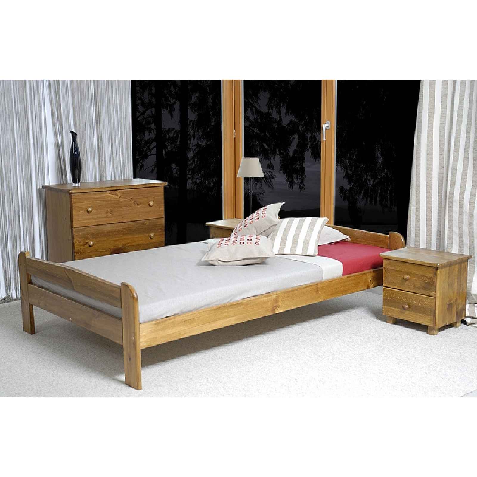 Postel 90x200 cm Materiál: masiv borovice, moření - dub, tloušťka 2,6 cm Postel je ručně barvená, následně lakovaná, broušená a opět lakovaná. Rozměry: šířka x délka: 97 x 205 cm ložná plocha: 90 x 200 cm výška čela: 50 cm výška od země k matraci: 25 cm výška od země ke spodní části lůžka: 20 cm hloubka od roštu po okraj postele: 7 cm Postel je dodávána včetně lamelového roštu, bez matrace. Dodáváno v demontu. Záruka 24 měsíců.
