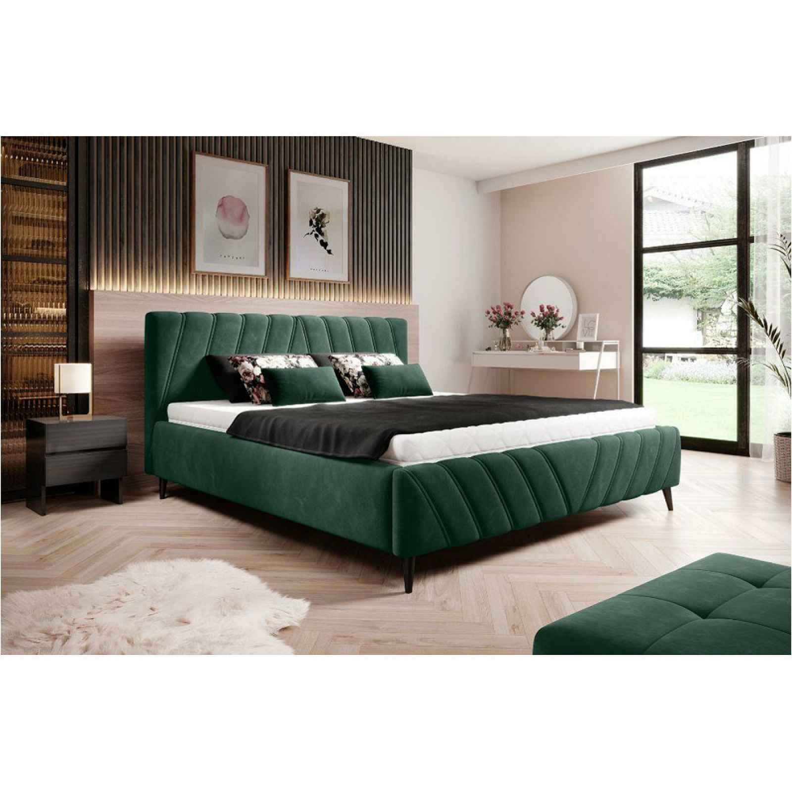 Tento výrobek je k dispozici POUZE ONLINE. Okouzlující čalouněná postel MELLI hned na první pohled upoutá svým jedinečným vzhledem s tmavě zeleným velurovým potahem a ozdobným prošíváním na vysokém záhlaví a nožní části. Černé kónické nožičky, vysoké asi 15 cm, dotváří celkový design. Jejich výška také umožňuje lepší úklid pod nábytkem. S celkovými rozměry přibližně 158 x 106 x 222 cm (Š/V/H) a plochou lůžka cca 140 x 200 cm přesvědčí tato postel vizuálně i funkčně. Výška rámu postele je asi 46 cm, výška ležení tedy bude záviset na výšce zvolené matrace. Součástí je i dřevěný rošt, který lze ze strany od nohou vyklopit pomocí plynového pístu. Pod roštem se nachází velkorysý úložný prostor. Čalouněná postel MELLI se v našem internetovém obchodě nabízí v bohatém výběru rozměrů a barev. Tento produkt vlastní certifikát FSC, materiál pro výrobu byl použit z ekologického lesního hospodářství. Upozornění: Dodává se bez matrace a vyobrazených lůžkovin. Vhodné příslušenství naleznete v na≻aro