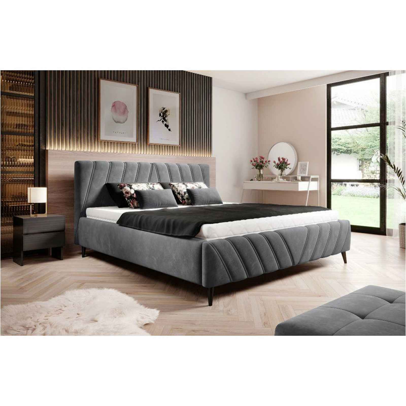 Tento výrobek je k dispozici POUZE ONLINE. Okouzlující čalouněná postel MELLI hned na první pohled upoutá svým jedinečným vzhledem s šedým velurovým potahem a ozdobným prošíváním na vysokém záhlaví a nožní části. Černé kónické nožičky, vysoké asi 15 cm, dotváří celkový design. Jejich výška také umožňuje lepší úklid pod nábytkem. S celkovými rozměry přibližně 198 x 106 x 222 cm (Š/V/H) a plochou lůžka cca 180 x 200 cm přesvědčí tato postel vizuálně i funkčně. Výška rámu postele je asi 46 cm, výška ležení tedy bude záviset na výšce zvolené matrace. Součástí je i dřevěný rošt, který lze ze strany od nohou vyklopit pomocí plynového pístu. Pod roštem se nachází velkorysý úložný prostor. Čalouněná postel MELLI se v našem internetovém obchodě nabízí v bohatém výběru rozměrů a barev. Tento produkt vlastní certifikát FSC, materiál pro výrobu byl použit z ekologického lesního hospodářství. Upozornění: Dodává se bez matrace a vyobrazených lůžkovin. Vhodné příslušenství naleznete v naš