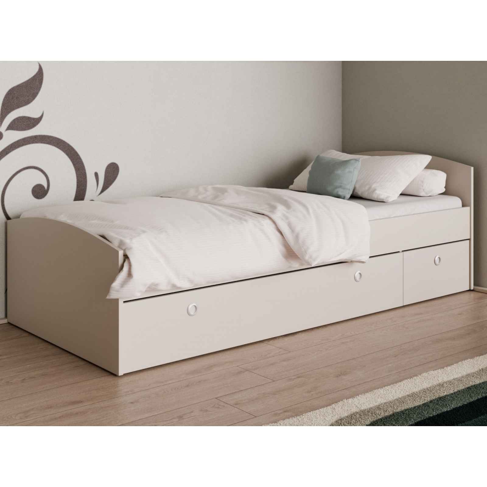 Jednolůžková postel o rozměru 90x200 cm vyniká především svými praktickými úložnými prostory ve spodní části. Vyrobena v kašmírově béžové barvě. - materiál: laminovaná dřevotříska 18 mm/16 mm, kov, plast - dekor: béžová kašmír mat - přední/zadní čelo: zaoblený tvar - plocha lůžka: 90x200 cm - bez roštu (kombinovat s lamelovým roštem velikosti 90x200) - bez matrace (kombinovat s matrací velikosti 90x200) - výška bočního rámu (bočnice): 42 cm - hloubka pro uložení roštu do rámu: 12 cm - 1 x výsuvná úložná zásuvka na kolečkách (univerzální montáž zásuvek na pravou/levou stranu postele, vnitřní rozměry: 144,5x19x81,5 cm) - 1 x výsuvný odkládací stolek v úložném prostoru (po vysunutí poslouží např. jako noční stolek, vnitřní rozměry: 43,5x15x44 cm) - český výrobek - dodáváno v demontu