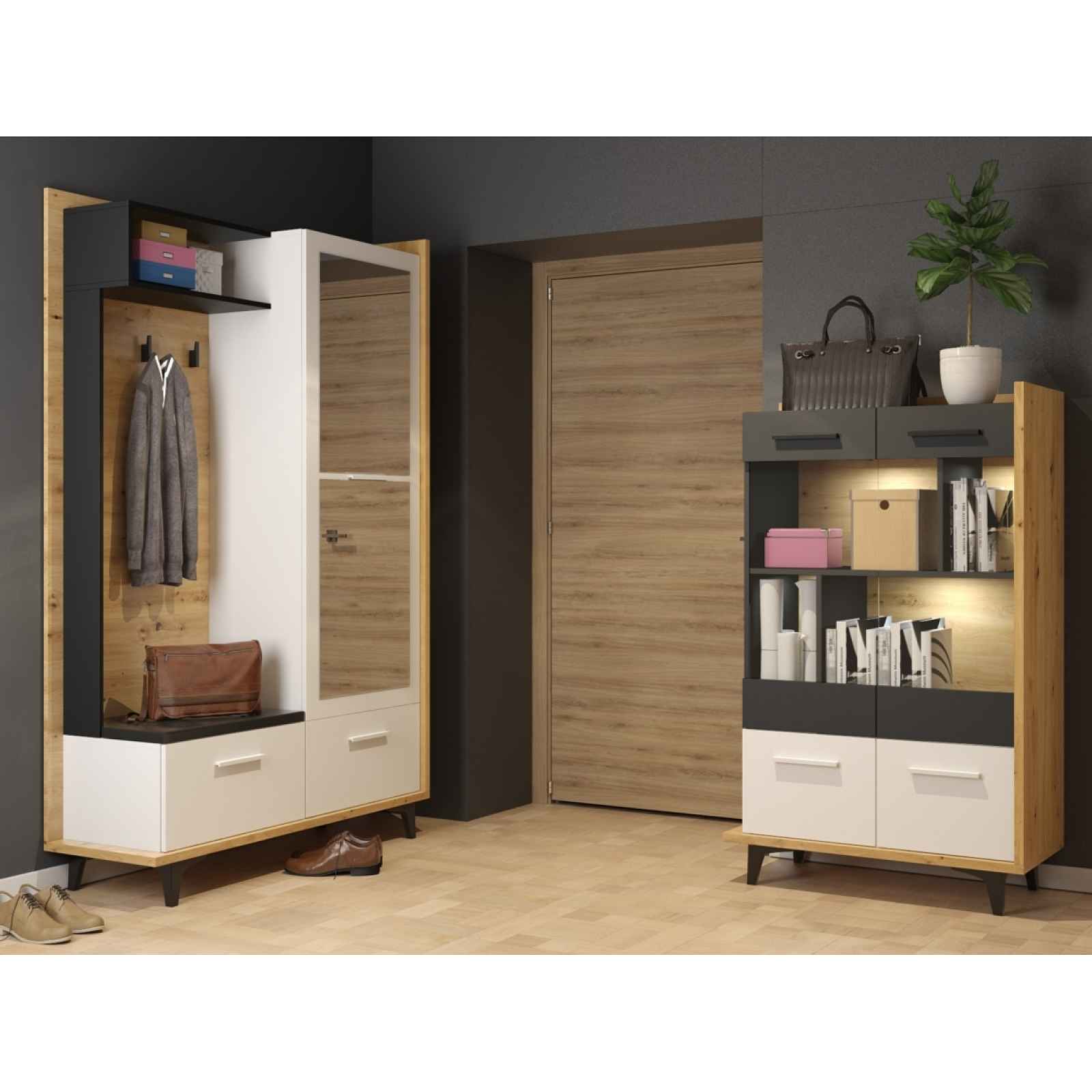 Vzorová sestava předsíně Uvádíme pouze jako ilustrativní příklad jedné z možných sestav, kterou lze poskládat z jednotlivých segmentů. Jednotlivé díly si je možno vybrat a koupit každý zvlášť. Příkladová sestava zahrnuje: - předsíň 3D (šxvxh): 125 x 195 x 42 cm - vitrína 2D (šxvxh): 85 x 139 x 42 cm Barva: dub artisan/bílá/černá Výška nožek: 12 cm Materiál: - kombinace kvalitního lamina o tloušťce 16 a 25 mm, hrany jsou chráněny ABS - podsedák - molitan (tloušťka 2 cm) potažen černou ekokůží - sklo Dodáváno v demontu. Záruka 5 let.