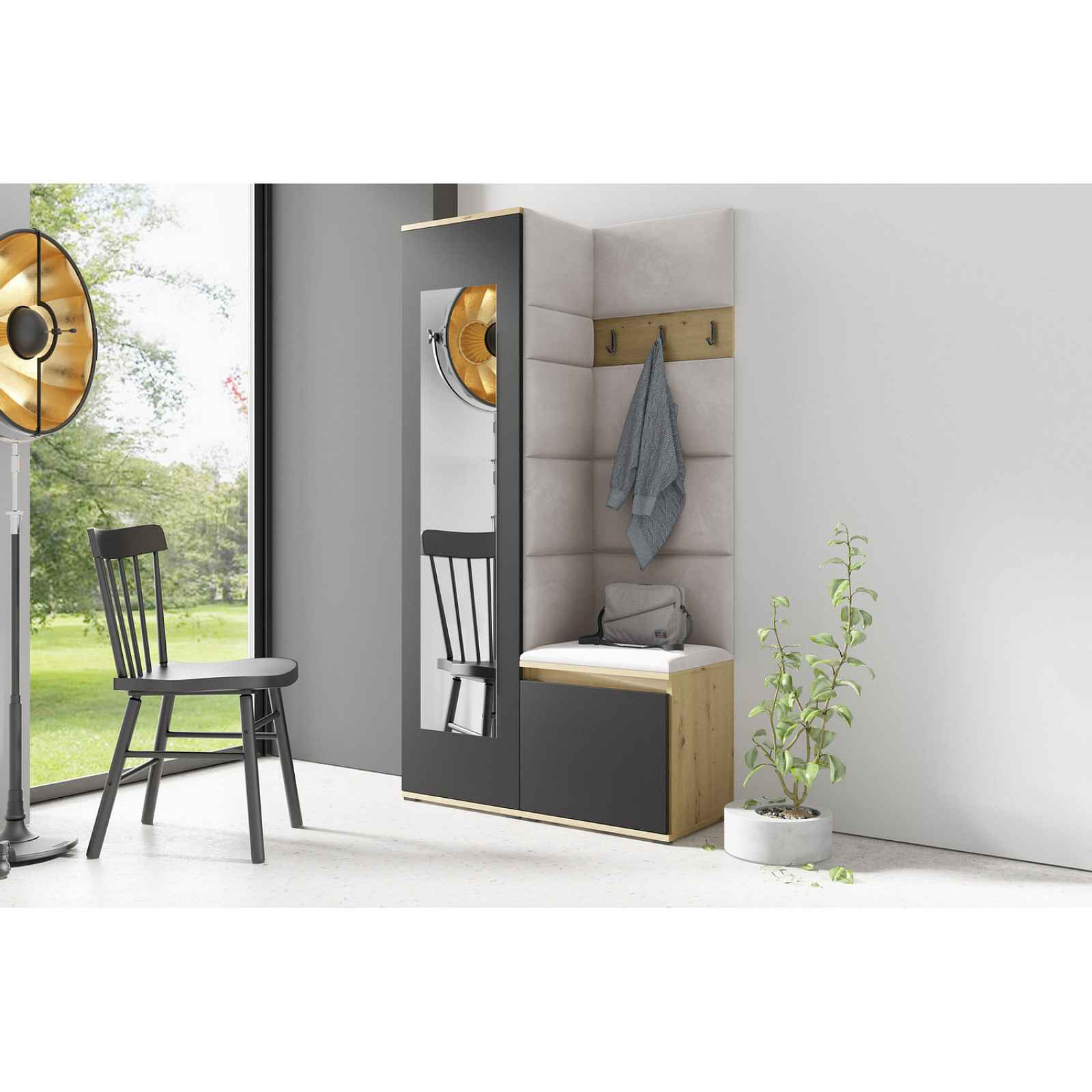 Předsíňová stěna AMI 13, je moderní a praktický prvek do vstupních prostor vašeho domu. Předsíňová stěna obsahuje deset čalouněných panelů, které se montují přímo na stěnu za pomoci lepidla. Potah botníku je tkanina TRINITY, která je měkká a příjemná na dotek. Jedná se o velurovou tkaninu. Předsíňová stěna se skládá z několika částí. Údržba: Vyhněte se použití chemikálií. Lepidlo není součástí balení.