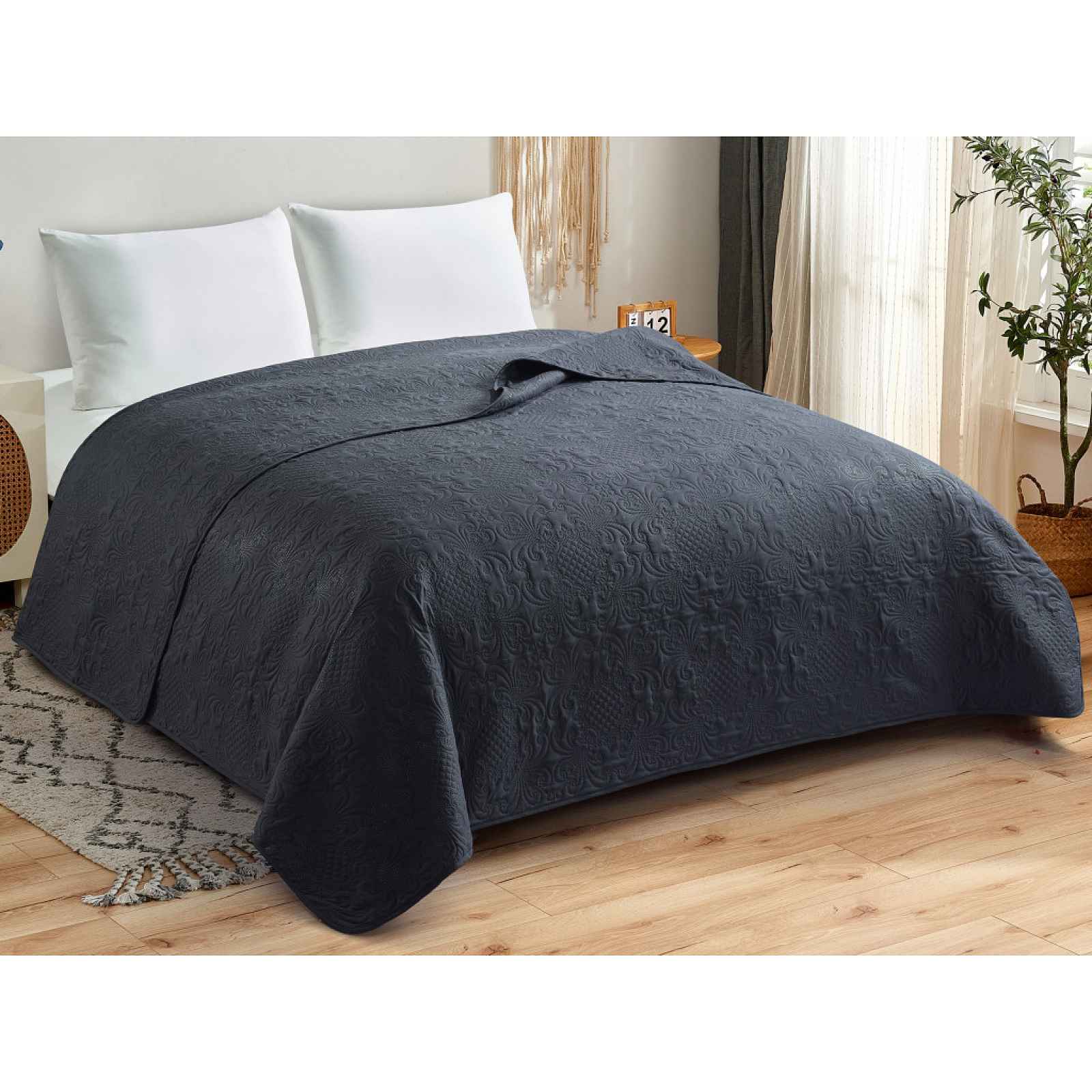 Přehoz na postel 220x240 cm v černé barvě s ornamentálním prošívaným vzorem zútulní každou ložnici. Přehoz přes postel 220×240 cm je nejen stylový, ale i praktický doplněk do každé domácnosti. Přehoz v černé barvě dodá ložnici nádech elegance a skvěle doplní jakýkoliv interiér. Přehoz je zdoben jemným, ale bohatým reliéfním ornamentálním vzorem, který dodává látce hloubku a luxusní texturu. Přehoz je ideální nejen na postel, ale také jako dekorativní doplněk na pohovku. - rozměr: 220×240 cm - materiál: 100% polyester - barva: černá - prošívaný vzor: ornamenty - vhodné jako přehoz přes postel nebo přehoz na pohovku - univerzální použití - možnost praní na 40 °C - lze sušit v sušičce