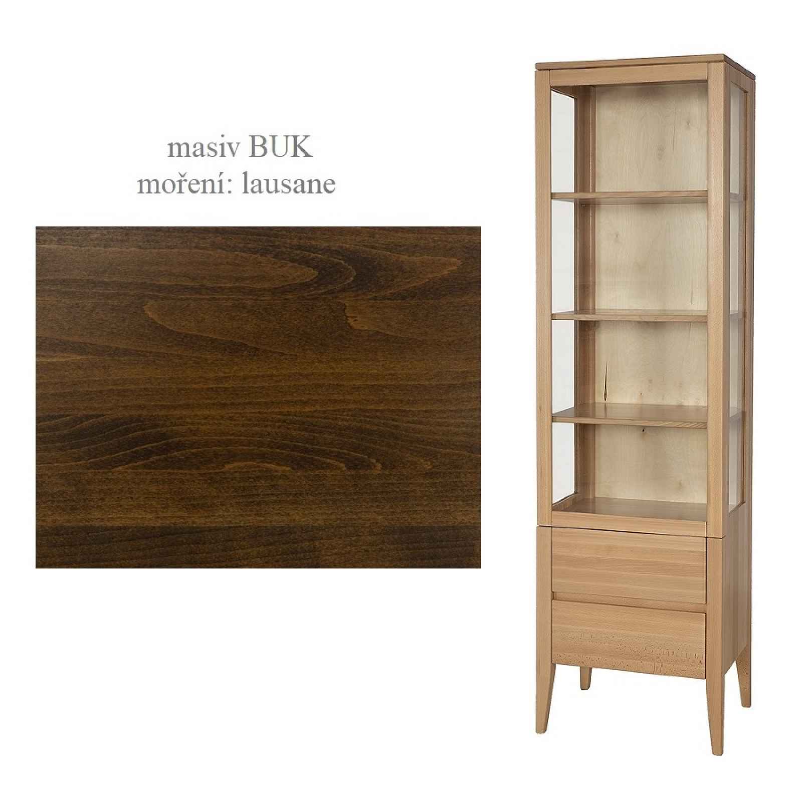 Buková vitrína v levém provedení.Je novinkou v kolekci Retro vyrobenou z bukového dřeva.Její klasický design se bude velmi dobře hodit k tradičnímu i modernímu uspořádání interiéru Vašeho domova.Výhodou této vitríny jsou její rozměry, které vám umožní vyzdobit i malý interiér obývacího pokoje nebo jídelny.Na policích za skleněnou částí si můžete vystavit své suvenýry, dekorace nebo krásné nádobí. Spodní zásuvky se budou hodit pro uložení drobností.Přírodní barva nábytku Vám umožní vytvořit v jídelně nebo obývacím pokoji jedinečnou útulnou atmosféru.Rozměry (šxvxh): 55 x 195 x 40 cmMateriál: masiv bukBarva: lausane viz vzorek mořeníDodáváno v demontu