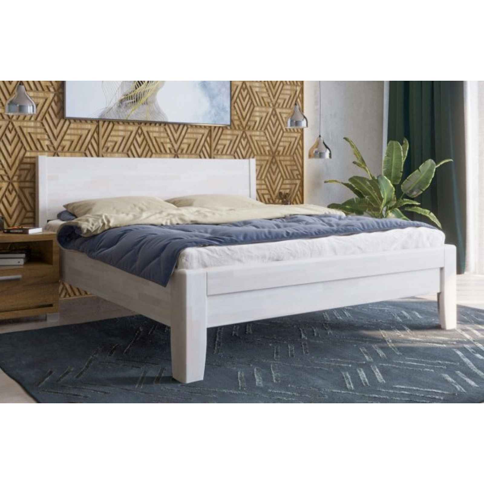 Celin K1 s plným hlavovým čelem, které je zasazené pod mírným úhlem do masivních nahou postele. Pro výrobu celomasivních postelí jsou používány výhradně dvě dřeviny. Moderní, čistý a hladký buk nebo majestátní dub s výraznou kresbou dřeva. Z pohledu pevnosti postele lze označit buk i dub za stejně tvrdé dřeviny, finální tvrdost je pak vždy dána místem původu dané dřeviny. Pocitově však jednoznačně vede nám známý majestátní dub se svou širokou korunou. Sama skutečnost, že právě na pilotech z dubu stojí Benátky, v nás evokuje pocit pevnosti a dlouhověkosti. Na výběr dvě varianty povrchové úpravy: Lakovaná, respektive mořená a lakovaná povrchová úprava, představující 10 barevných odstínů včetně přírodního provedení. Jedná se o kvalitní lak, tvořící odolnou ochranu povrchu postele. Běžnou údržbu a úklid lze provádět suchým nebo lehce vlhkým hadříkem. 2. Povrchová úprava postele směsí oleje a vosku, přičemž olej proniká do hloubky 1 – 2 mm do dřeva a vosk zůstávající na povrchu. vytváří hedvábný lesk. Jedná se o kvalitní ekologickou povrchovou úpravu speciálními osmo oleji. Běžnou údržbu a úklid lze provádět suchým nebo lehce vlhkým hadříkem. Generální údržbu a oživení povrchu lze provést dalším nátěrem osmo oleje a následným vytřením do sucha. Pevnost: Všechny typy postelí mají pevné rohové spojení. skládající se z léty prověřené kombinace matice šroubu a závrtné matice umožňující pohodlné dotažení. Na pevnost celého rámu postele je poskytována záruka 5 let. Výška hlavového čela: 105 cm. Výška nožního čela: 50 cm. Výška horní hrany bočnice od země: 50 cm. Vlastní výška bočnice: 27 cm. Hmotnost postele: Při výběru postele je potřeba brát zřetel i na vlastní hmotnost postele, neboť pohlcení kinetické energie je přímo úměrné hmotnosti postele. Úložné prostory: Postel Celin je možné doplnit praktickým úložným prostorem v podobě přední nebo boční zásuvky nebo úložného boxu pod postel přístupného z horní části postele. Postel je standardně dodávána bez roštů a matrací. Postel je dodávána v demontovaném stavu. Montáž postele je možné si přiobjednat.