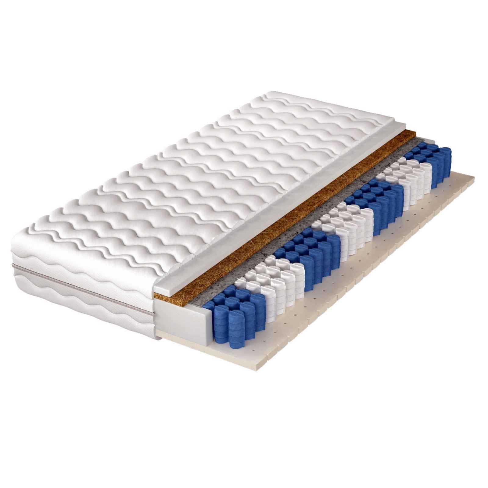 Pružinová matrace 80x200 cmPružinovo-latexová matrace je oboustranná, má letní a zimní stranu. Jedna strana matrace je ze 100 % přírodní bavlny, která je vhodná pro letní noci. Druhá strana matrace je z ovčí vlny, která dokonale absorbuje pot a udržuje tělesnou teplotu na konstantní úrovni. Strana z ovčí vlny je tedy doporučena pro chladné zimní noci. Matrace má taštičkové pružiny, které zaručují lepší přizpůsobení tvaru těla. Každá pružina je umístěna v samostatné kapse. Pružiny mají různou tvrdost, jsou rozmístěny tak, aby tvořili sedm zón. Taštičkové pružiny k sobě nejsou spojeny, což znamená, že každá pružina pracuje samostatně a zamezuje tak ohýbání matrace pod vysokým tlakem na malé plochy. Pružiny matrace jsou z jedné strany pokryty kokosovou deskou o tloušťce 1 cm a z druhé strany je latexová pěna o tloušťce 3 cm. Kokosová deska má vynikající tepelné vlastnosti a zajišťuje správnou cirkulaci vzduchu uvnitř matrace. Vzhledem ke své přirozené struktuře kokosových vláken je lehká, vzdušná a má antialergické vlastnosti. Vyznačuje se vysokou flexibilitou, absorbuje pot a vlhkost. Díky kokosové desce je matrace mnohem tužší a odolnější proti deformaci. Latex se vyznačuje vysokou odolností a flexibilitou, tvar těla tak dokonale zapadá do latexové pěny a zaručuje vysoký komfort spánku. Díky otvorům uvnitř matrace je podroben neustálému procesu větrání. Počet pružin: 262 ks/m2 Matrace je hypoalergenní. Potah matrace lze vyprat na 40°C. Tvrdost matrace: středně tvrdá H2/tvrdá matrace H3 Rozměry (šxh): 80 x 200 cm Výška matrace: 20 cm Nosnost matrace: 130 kg Záruka 24 měsíců.