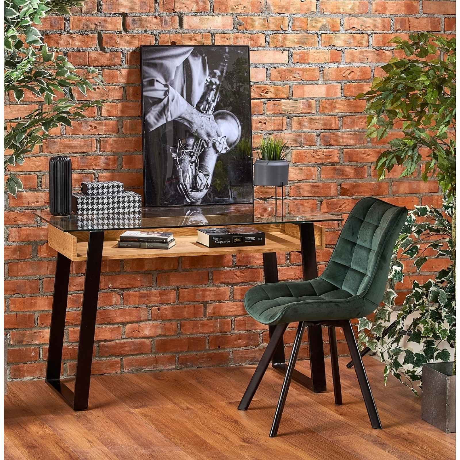 Psací stůl Barva: čiré sklo/dub zlatý/černá Rozměry (šxvxh): 120 x 75 x 60 cm Materiál: sklo, laminovaná MDF, lakovaná práškovaná ocel Dodání v demontu Záruka 24 měsíců.