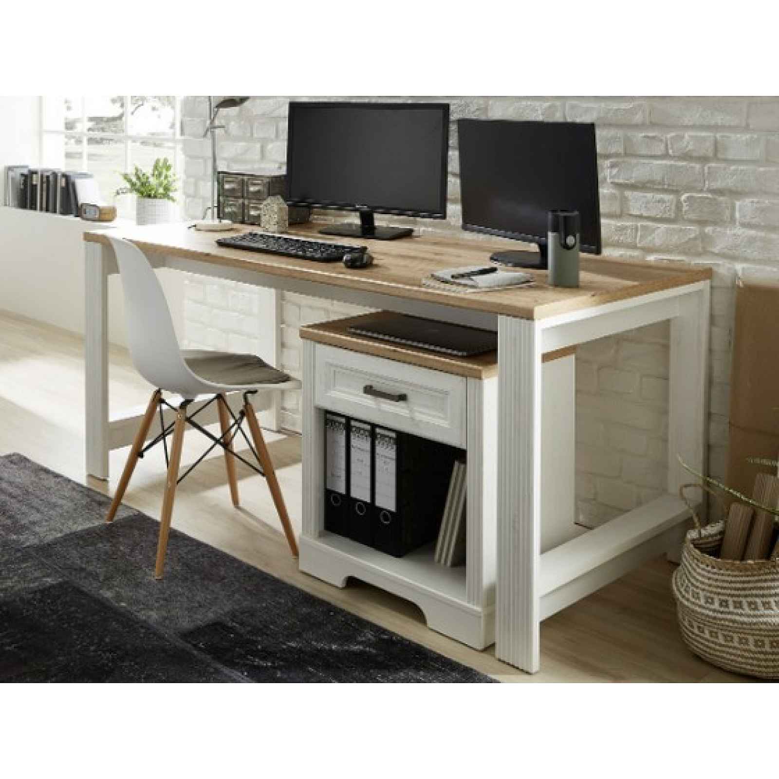 Psací stůl o velikosti 160x80 cm v provedení bělená pinie s dubovým dřevodekorem z kolekce Jasmin - nábytek v moderním venkovském stylu s důrazem na detail navazuje na tradici útulně zařízeného domova a přímo láká k tomu, abyste si vytvořili prostředí, kde se budete cítit dobře. Kombinujte tak jednotlivé elementy z této řady a vytvořte si stylový rustikální interier s nádechem tradice. - psací stůl z kolekce Jasmin - materiál: laminovaná dřevotříska 22 mm, MDF 28 mm - dekor: bělená pinie/dub artisan - členitá podnož - okrasně profilované čelní plochy - zesílený rám konstrukce - rustikální styl v moderním provedení - psací plocha: 160x80 cm (síla desky 28 mm) - doporučená nosnost do 30 kg - bez úložného kontejneru (možné objednat samostatně) - dodáváno v demontu