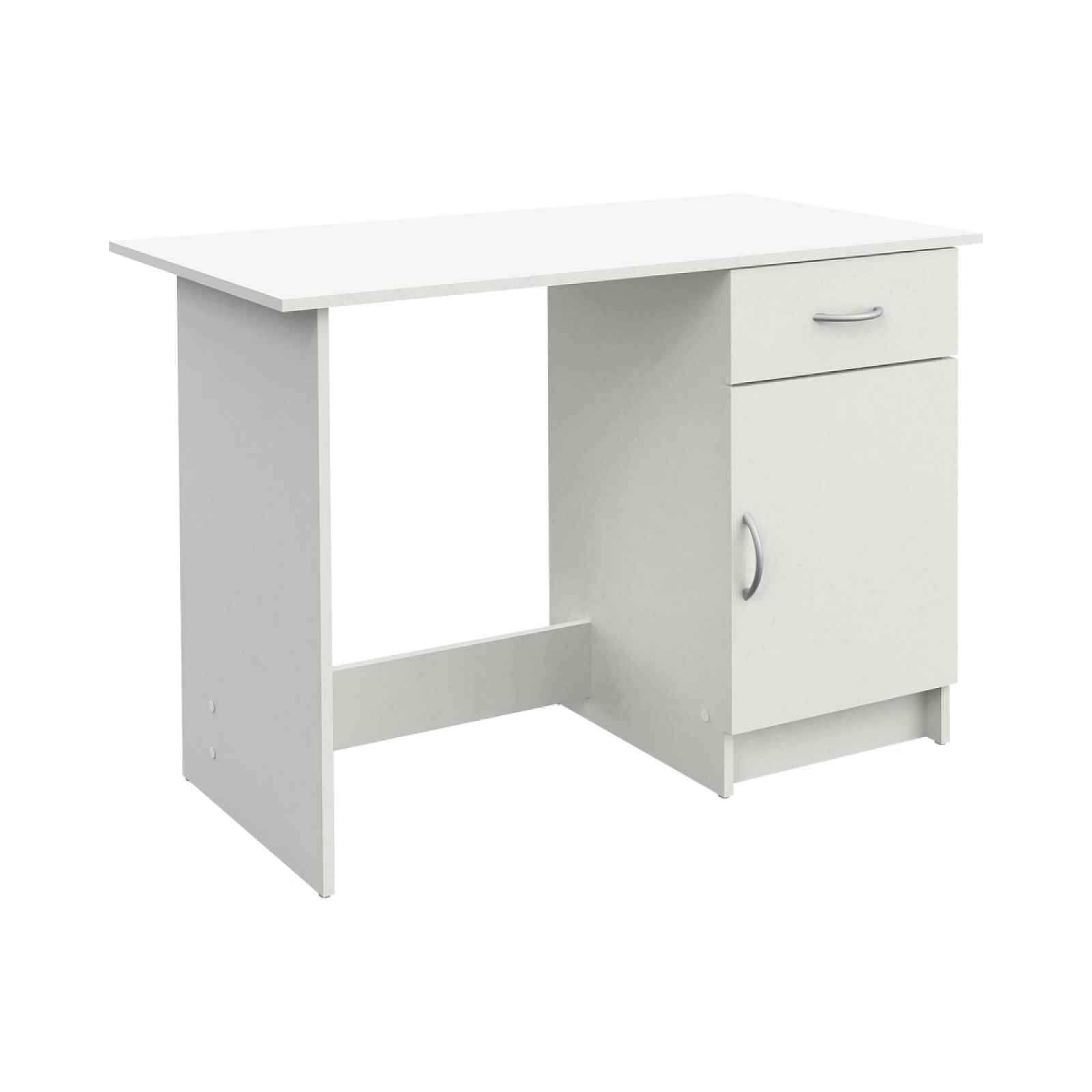 Psací stůl z lamina se zásuvkou a dvířky Barva: bílá Rozměr (šxvxh): 109 x 75 x 50 cm Materiál: lamino - lze využít variantu jak na levou, tak na pravou stranu - 1 dvířka s prostorem na větší dokumenty - 1 zásuvka s kovovými pojezdy o rozměru (šxvxh): 34 x 9 x 37 cm Dodání v demontu.