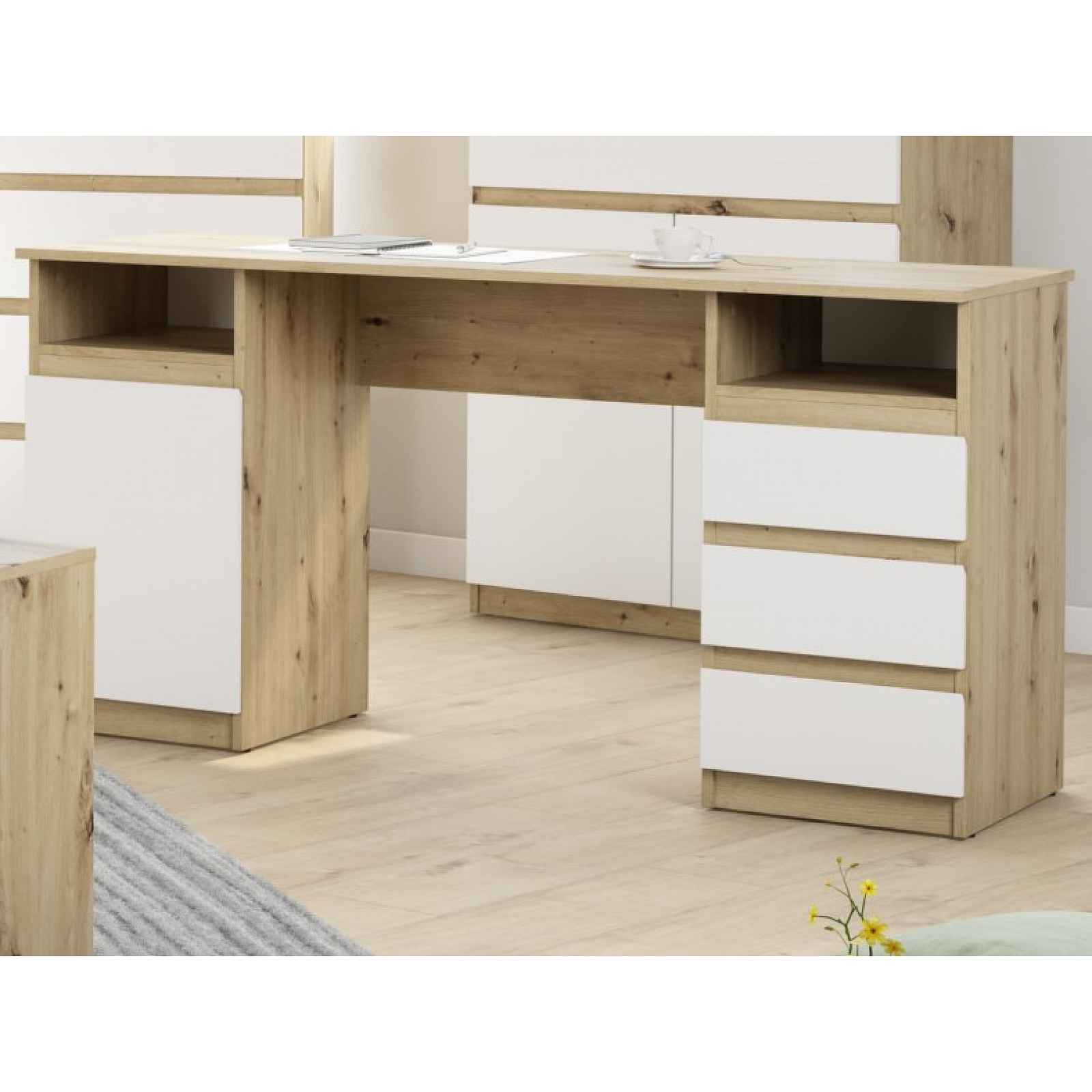 Prostorný psací stůl v dekoru dub artisan/bílá nabízí úložné prostory po obou stranách, účelnost a čisté linie tvarů, které se hodí do každého interieru. Prostorný psací stůl v dekoru dub artisan/bílá nabízí praktické úložné prostory po obou stranách, účelnost a čisté linie tvarů, které se hodí do každého interieru. - materiál: dřevotříska 16 mm, kov, plast - dekor korpus: dub artisan - dekor přední plochy: bílá mat - úchyt: bezúchytové otevírání horní hranou - nožky: přízemní minikluzáky - psací plocha: 138×55 cm - 2 x horní otevřená přihrádka - 3 x zásuvka (vnitřní rozměr 26×7,5×33 cm) - 1 x levé dveře (úložný prostor, 1 x police) - stabilní konstrukce - prostorný - univerzální do každého interieru - volná výška pod psací deskou: 73 cm - volná šířka pod psací deskou: 67,5 cm - dodáváno v demontu