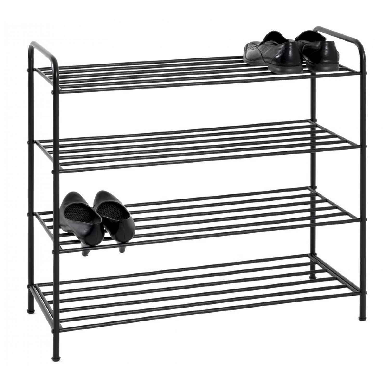 Černý kovový regál na boty se svým univerzálním designem hodí do moderní i klasické předsíně. Regálový botník nabízí 4 police pro odkládání až 16 párů bot. - konstrukce: kov - povrchová úprava: černý lak - 4 x police - kapacita až 16 párů bot - dodáváno v demontu
