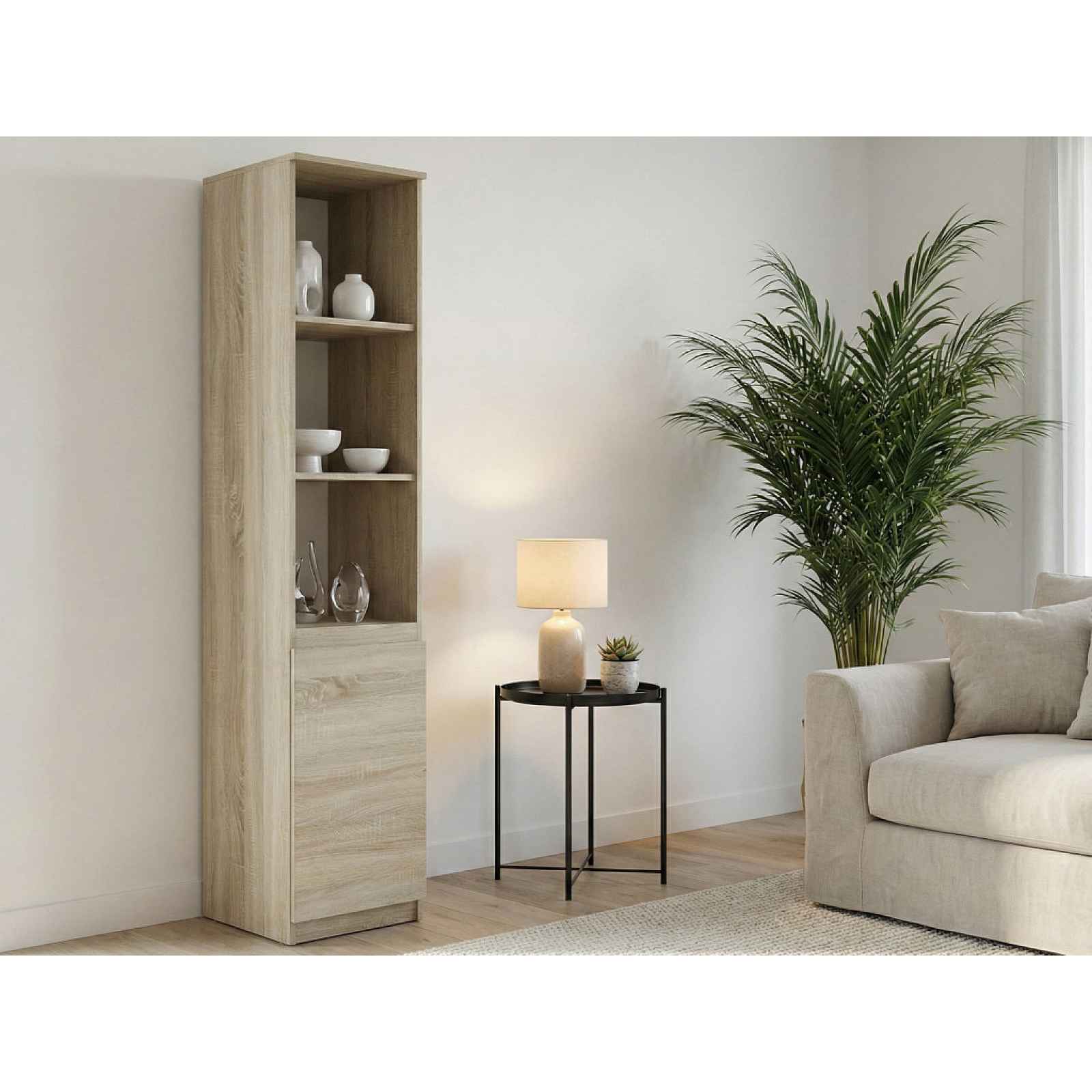 Regál s dvířky o šířce 40 cm v dekoru dub sonoma nabízí praktické úložné prostory, účelnost a čisté linie tvarů, které se hodí do každého interieru. Úzký regál s dvířky o šířce 40 cm v dekoru dub sonoma nabízí praktické úložné prostory, účelnost a čisté linie tvarů, které se hodí do každého interieru. Odkládací police jsou ideální pro vystavení knih, dekorací a dalších předmětů. Za otočnými dvířky se skrývá praktický úložný prostor s policí, který vám pomůže udržet pořádek v domácnosti. - regál s dvířky z programu Carlos - materiál: dřevotříska 16 mm, kov, plast - dekor: dub sonoma - úchyt: bezúchytové otevírání - nožky: přízemní minikluzáky - celková šířka: 40 cm - celková výška: 194 cm - 3 x otevřená přihrádka (2 x police, doporučená nosnost do 10 kg) - 1 otočné dveře (uni montáž jako pravé/levé, úložný prostor, 1 x police, doporučená nosnost do 10 kg) - stabilní - doporučené ukotvení ke stěně - univerzální do každého interieru - dodáváno v demontu