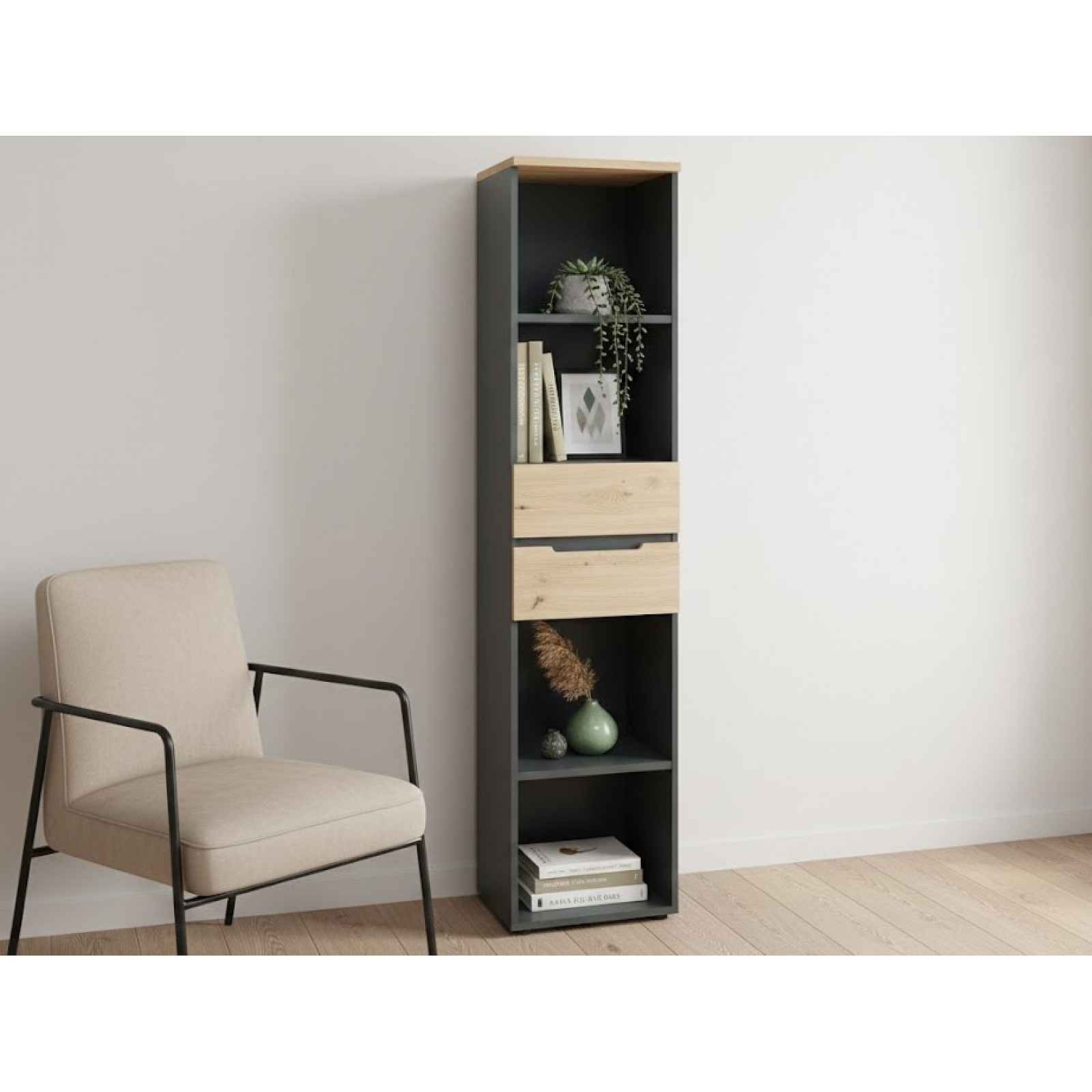 Úzký regál se zásuvkami z programu Memphis – nábytek v moderním a zároveň funkčním designu zaujme zajímavou profilací předních ploch. Úzký regál se zásuvkami z kancelářského programu Memphis – nábytek v moderním a zároveň funkčním designu zaujme zajímavou profilací předních ploch. Nábytek je vyroben v kontrastní kombinaci grafit s útulným dřevodekorem dub artisan. Odkládací police jsou ideální pro uspořádání knih, složek a pracovních materiálů v pracovně, koupelnových potřeb v koupelně anebo dekorativních předmětů v obývacím pokoji. Drobnosti také můžete uschovat do 2 šuplíků. Regál je možné využít v jakékoliv místnosti. - regál se zásuvkami z programu Memphis - materiál: laminová dřevotříska 16 mm/22 mm, MDF 18 mm, kov, plast - dekor: dub artisan/grafit mat - nožky: kluzáky, plast, černé - zajímavá profilace předních ploch - tiché dovírání zásuvek Softclose - moderní, elegantní styl - šířka: 45 cm - 4 x otevřená přihrádka - 3 x police (2 x výškově nastavitelná, 1 x pevná, max. doporučená nosnost police do 12 kg) - 2 x zásuvka (kovové boční pojezdy, doporučená nosnost 3 kg) - univerzální využití pro práci i domácnost: pro uložení kancelářských potřeb, dekorací nebo knih - zadní ukotvení ke stěně - vyrobeno v EU - dodáváno v demontu