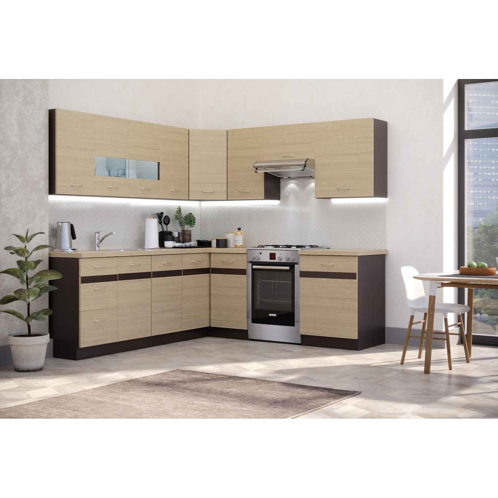 Rohová kuchyňská sestava Rohová kuchyně o rozměru 220x210 cm - jedná se jen o jednu z možných sestav, možno dokoupit další skříňky nebo celou kuchyni sestavit dle svých představ - viz zařazení produktu. Barva: - korpus: dub wenge - dvířka horních skříněk: rijeka světlá - dvířka dolních skříněk: rijeka světlá, pásek - dub wenge Materiál: kvalitní LTD - dolní skříňky: výška 82 cm, hloubka 45 cm, šířky: 80 cm - dolní dřezová skříňka D80Z 80 cm - dolní rohová skříňka D100NW 40 cm - dolní skříňka D40S3 40 cm - dolní skříňka D40 50 cm - dolní skříňka D50 - horní skříňky: výška 57,5 cm, hloubka 29,5 cm, šířky: 60 cm - horní rohová skříňka G60NW 40 cm - horní skříňka G40 - 3 kusy 50 cm - horní skříňka G50 60 cm - horní skříňka nad digestoř G60O 80 cm - horní vitrína G80W Součástí kuchyňské linky je dělená pracovní deska 2x 40 cm, 1x 50 cm a 1x 100 cm. Na skříňku pod dřez se pracovní deska nedodává! Vychází se z toho, že si tam umístíte celoplošný dřez 80x60 cm. Dřez a spotřebiče nejsou v ceně. Dodává se v demontu. Záruka 24 měsíců.