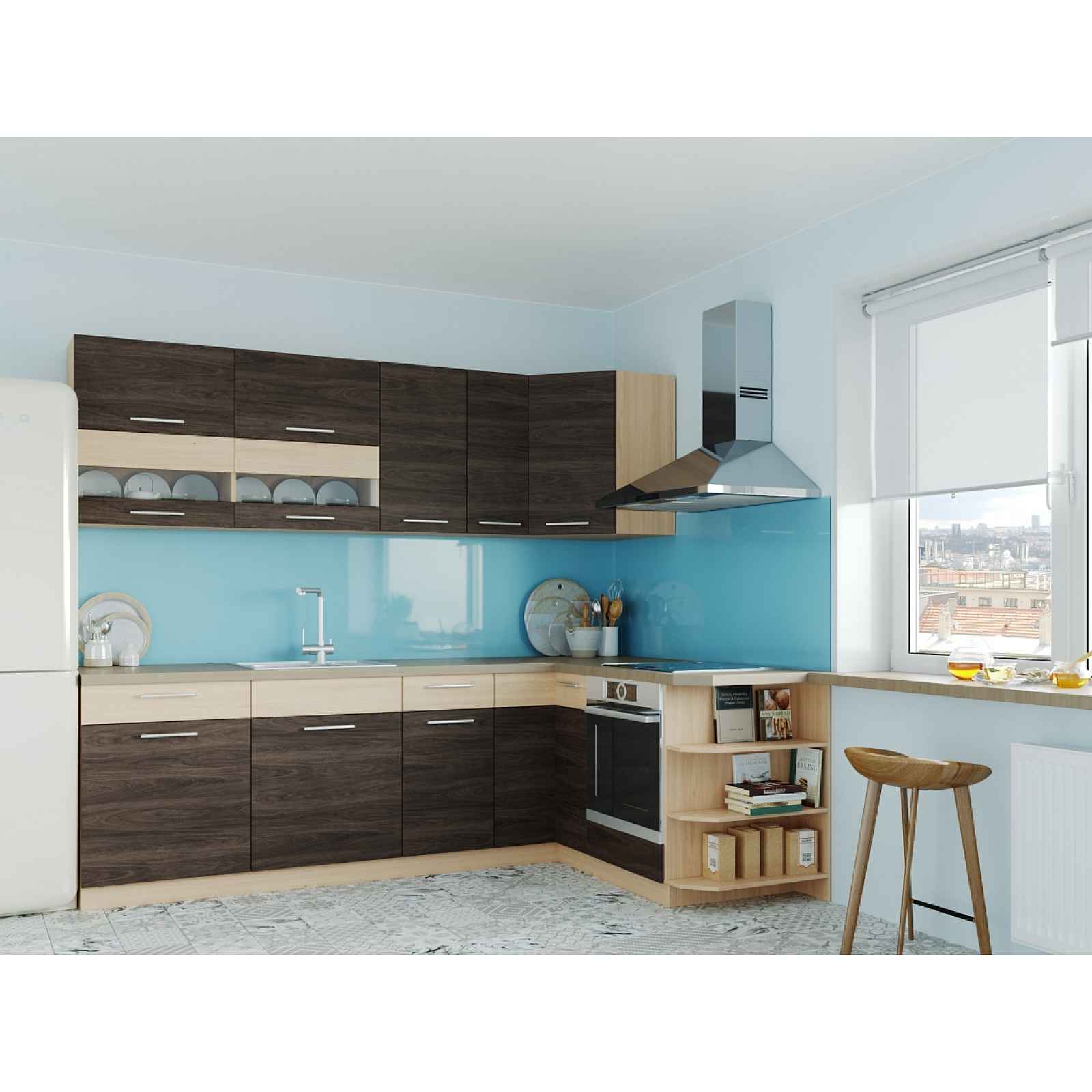 Rohová kuchyňská sestava Rohová kuchyně o rozměru 250x170 cm - jedná se jen o jednu z možných sestav, možno dokoupit další skříňky nebo celou kuchyni sestavit dle svých představ - viz zařazení produktu. Barva: korpus - rijeka světlá, dvířka - rijeka tmavá/rijeka světlá Rozměry: - dolní skříňky: výška 82 cm, hloubka 50 cm, šířky: 60 cm - dolní dřezová skříňka D60Z 82 cm - dolní rohová skříňka D90NW 40 cm - dolní skříňka D40S1 60 cm - dolní skříňka D60S1 20 cm - dolní skříňka D20NZ 60 cm - dolní skříňka na vestavnou troubu D60P - horní skříňky: výška 72 cm, hloubka 30 cm, šířky: 60 cm - horní rohová skříňka G60NW 40 cm - horní skříňka G40 30 cm - horní skříňka G30 60 cm - horní vitrína G60W - 2 kusy Materiál LTD, ABS hrana 2 mm. Kovové pojezdy METALBOX v zásuvkách Dřez, spotřebiče a pracovní deska nejsou v ceně. Dodává se v demontu. Záruka 24 měsíců.
