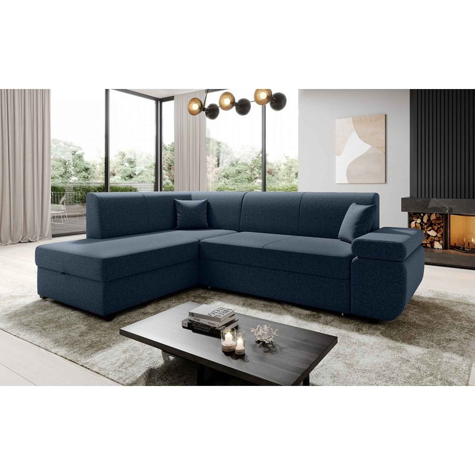 Rozkládací rohová sedačka, leváObrázek rozkladu je pouze ilustrativní (jiná barva)! Potahová látka: solid 79 = tmavě modrá látka Součástí jsou 2 dekorační polštáře a úložný prostor. Celočalouněná, vhodná do prostoru. Rozměr (šxvxh): 261 x 90 x 175 cm Ložná plocha (šxh): 196 x 128 cmVýška sedu: 43 cmHloubka sedu: 60 cmRozměry úložného prostoru (šxh): 85 x 165 cm Materiál: pružina typu bonell, polyuretanová pěna T25 Nohy dřevěné. Dodáváno v demontu. Rozměry (šxvxh) a váhy balíků: 1. balík - 175 x 90 x 100 cm, 64 kg2. balík - 170 x 90 x 100 cm, 72 kg