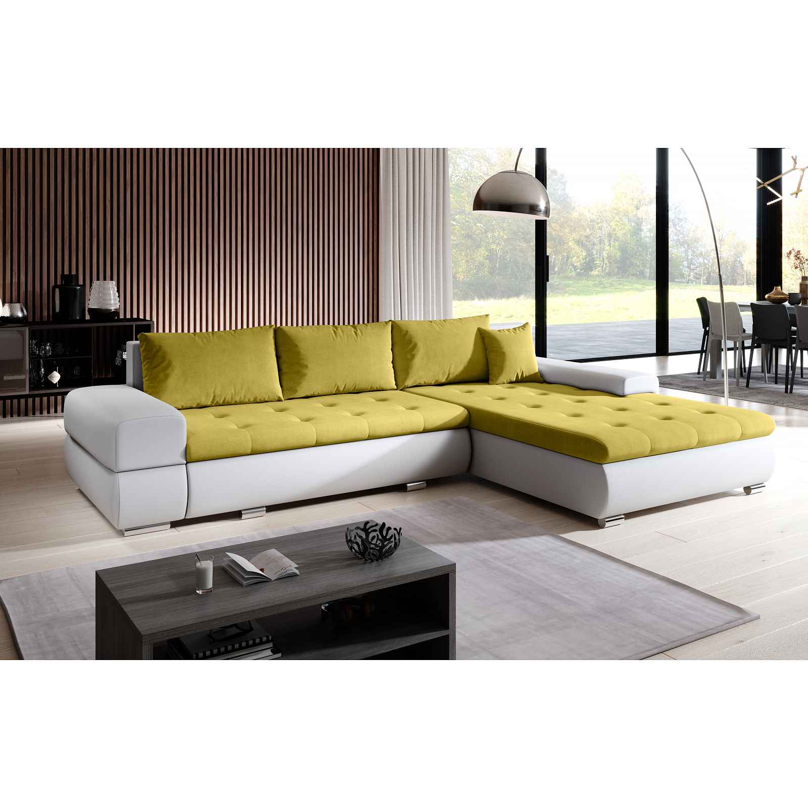 Rozkládací rohová sedačka Sedačka je univerzální = roh lze smontovat na pravý i levý! Potahová látka: orinoco 40 = žlutá látka/madryt 120 = bílá ekokůže Součástí jsou polštáře a úložný prostor. Obrázek rozložené sedačky je ilustrativní (jiná barva)! Rozměr (šxvxh): 314 x 85 (80 cm bez polštářů) x 210 cm Ložná plocha (šxh): 255 x 150 cmVýška sedu: 39 cmHloubka sedu: s polštáři 65 cmRozměry úložného prostoru (šxhxv): 148 x 70 x 22 cmVýška nožek: 5 cm Materiál: pružina vlnitá, polyuretanová pěna T30 Nohy plastové. Dodáváno v demontu. Záruka 24 měsíců.