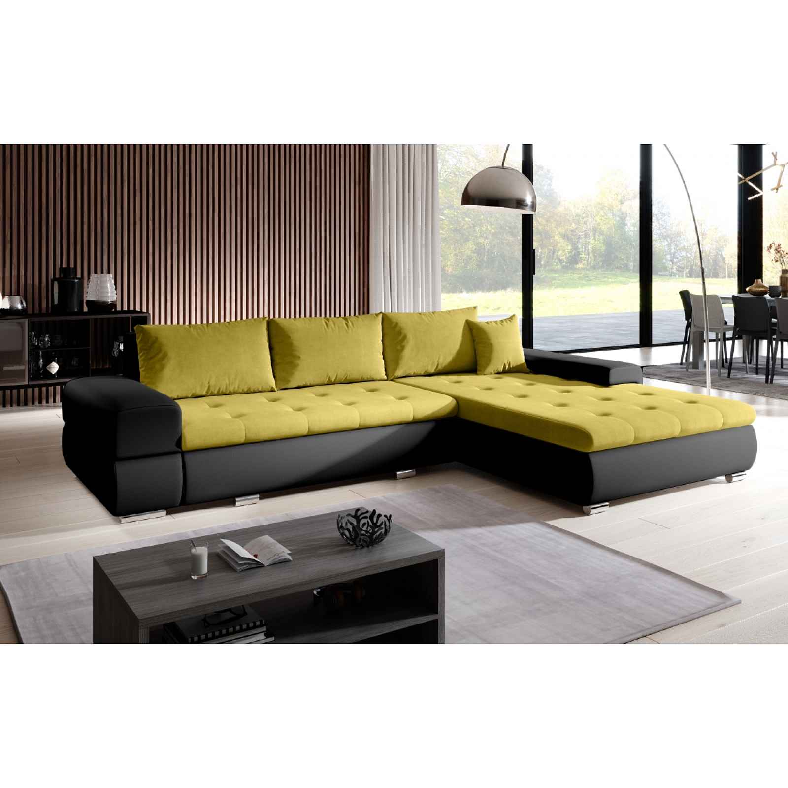 Rozkládací rohová sedačka Sedačka je univerzální = roh lze smontovat na pravý i levý! Potahová látka: orinoco 40 = žlutá látka/madryt 1100 = černá ekokůže Součástí jsou polštáře a úložný prostor. Obrázek rozložené sedačky je ilustrativní (jiná barva)! Rozměr (šxvxh): 314 x 85 (80 cm bez polštářů) x 210 cm Ložná plocha (šxh): 255 x 150 cmVýška sedu: 39 cmHloubka sedu: s polštáři 65 cmRozměry úložného prostoru (šxhxv): 148 x 70 x 22 cmVýška nožek: 5 cm Materiál: pružina vlnitá, polyuretanová pěna T30 Nohy plastové. Dodáváno v demontu. Záruka 24 měsíců.