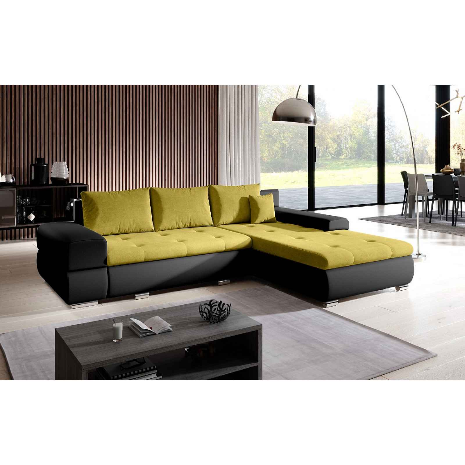 Rozkládací rohová sedačkaSedačka je univerzální = roh lze smontovat na pravý i levý! Obrázek rozkladu je pouze ilustrativní (jiná barva)! Potahová látka: orinoco 40 = žlutá látka/madryt 1100 = černá ekokůže Součástí jsou polštáře se zipem a úložný prostor. Celočalouněná, vhodná do prostoru. Rozměr (šxvxh): 275 x 83 (80 cm bez polštářů) x 190 cm Ložná plocha (šxh): 200 x 150 cmVýška sedu: 39 cmHloubka sedu: 65 cm (90 cm bez podušek)Rozměry úložného prostoru (šxh): 130 x 70 cm Materiál: pružina vlnitá, polyuretanová pěna T30 Nohy kovové chromované. Dodáváno v demontu. Rozměry (šxvxh) a váhy balíků: 1. balík (otoman) - 177 x 40 x 103 cm, 38 kg2. balík - 134 x 60 x 92 cm, 67 kg3. balík (boky) - 124 x 55 x 60 cm, 30 kg