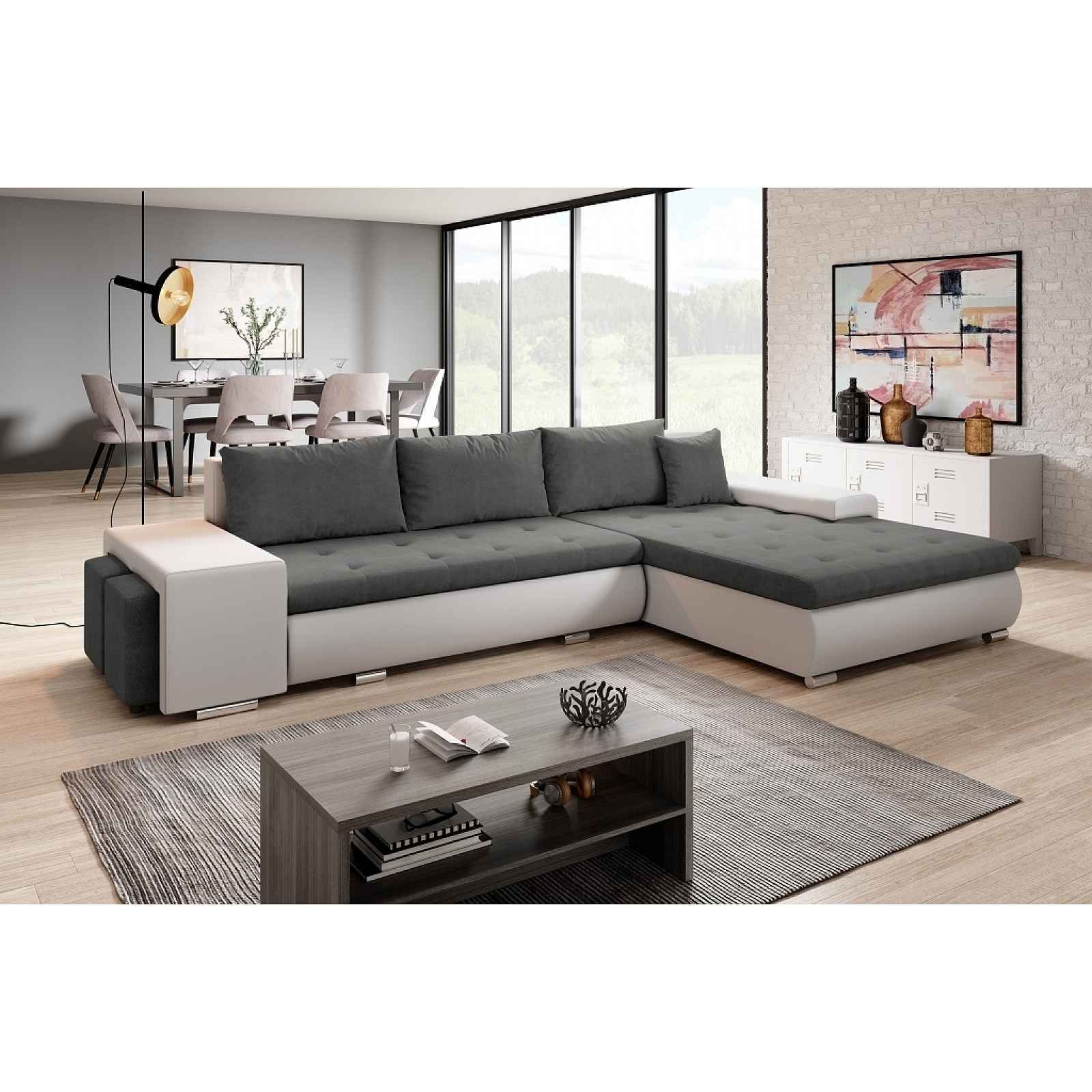 Rozkládací rohová sedačka s taburetySedačka je univerzální = roh lze smontovat na pravý i levý! Obrázek rozkladu je pouze ilustrativní (jiná barva)! Potahová látka: orinoco 96 = šedá látka/madryt 120 = bílá ekokůže Součástí jsou polštáře se zipem, 2 taburety a úložný prostor. Celočalouněná, vhodná do prostoru. Rozměr (šxvxh): 325 x 85 (80 cm bez polštářů) x 210 cm Ložná plocha (šxh): 248 x 150 cmVýška sedu: 39 cmHloubka sedu: 65 cm (90 cm bez podušek)Rozměry úložného prostoru (šxh): 148 x 70 cmRozměr taburetů (šxvxh): 40 x 38 x 40 cm Materiál: pružina vlnitá, polyuretanová pěna T30 Nohy kovové chromované. Dodáváno v demontu. Rozměry (šxvxh) a váhy balíků: 1. balík (otoman) - 205 x 44 x 125 cm, 59,5 kg2. balík - 152 x 57 x 96 cm, 68,5 kg3. balík (bok L) - 125 x 35 x 60 cm, 17 kg4. balík (bok s taburety) - 110 x 50 x 50 cm, 35 kg