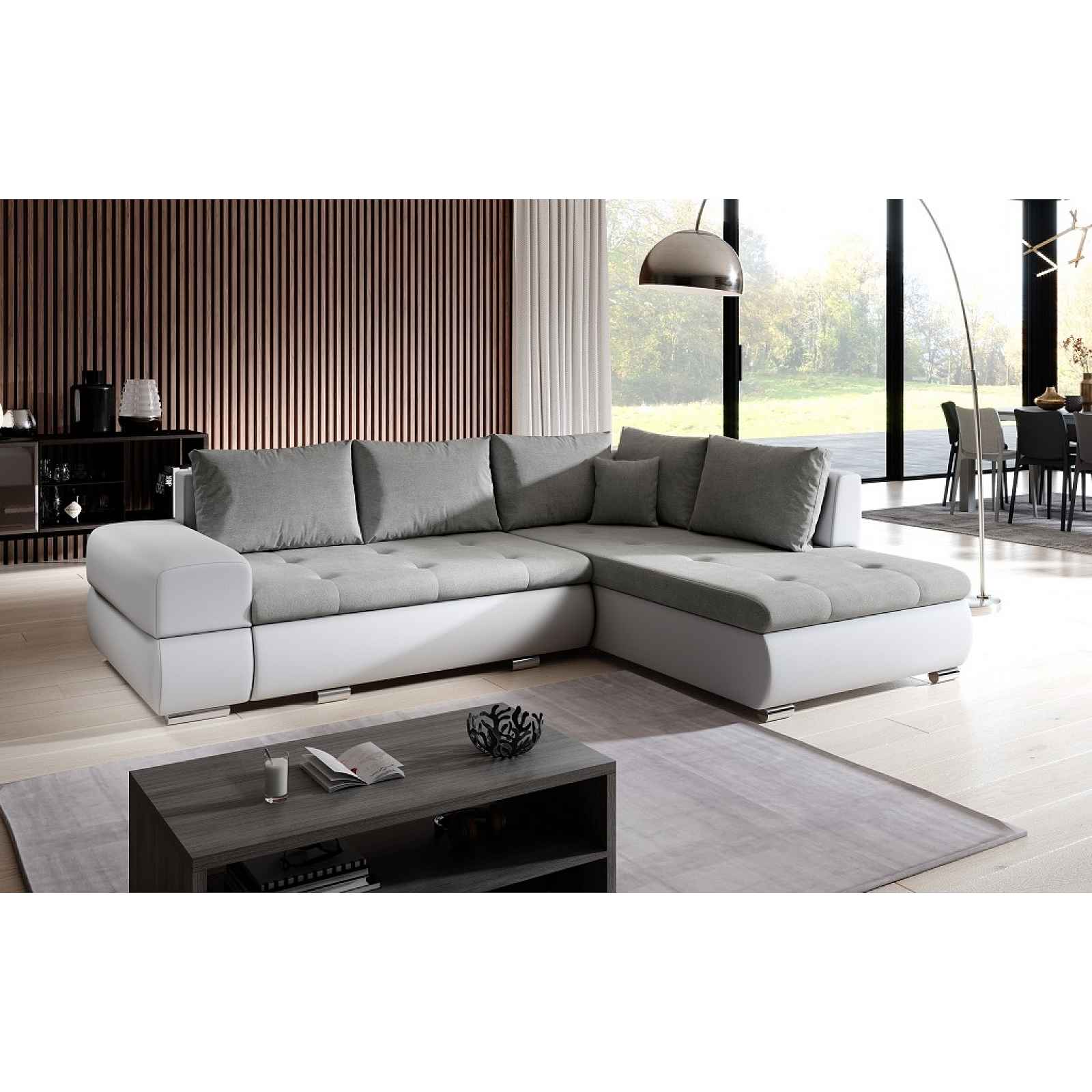 Rozkládací rohová sedačkaSedačka je univerzální = roh lze smontovat na pravý i levý! Potahová látka: orinoco 90 = světle šedá látka/madryt 120 = bílá ekokůže Součástí jsou polštáře se zipem a úložný prostor. Celočalouněná, vhodná do prostoru. Rozměr (šxvxh): 272 x 83 (80 cm bez polštářů) x 190 cm Ložná plocha (šxh): 206 x 149 cmVýška sedu: 39 cmHloubka sedu: s polštáři 65 cm, bez polštářů 90 cmRozměry úložného prostoru (šxh): 128 x 70 cm Materiál: pružina vlnitá, polyuretanová pěna T30 Nohy plastové. Dodáváno v demontu. Rozměry (šxvxh) a váhy balíků: 1. balík - 185 x 80 x 115 cm, 65 kg2. balík (středový sed) - 135 x 63 x 93 cm, 70 kg3. balík (boky) - 140 x 85 x 65 cm, 45 kg