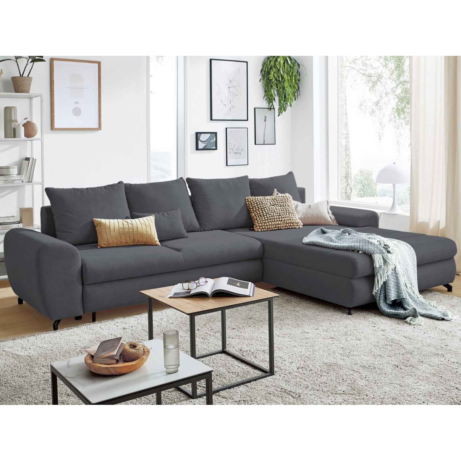 Atraktivní rohová sedací souprava se zaoblenými tvary, očalouněná látkou v tmavě šedé, s úložným prostorem a funkcí rozkladu na lůžko. Atraktivní rohová sedací souprava se zaoblenými tvary nabízí příjemně měkký styl sezení pro Váš každodenní komfort. Očalouněna látkou v barvě tmavě šedá. Další přidanou hodnotou je praktický úložný prostor a navíc rozkládací funkce - díky ní se sedačka snadno promění na příležitostné lůžko třeba pro návštěvu. Díky univerzálně řešené konstrukci lze sedačku sestavit jako pravý anebo levý roh, respektive s otomanem na pravé anebo levé straně - sedačka se tak lépe přizpůsobí prostorovým možnostem Vašeho obýváku. - konstrukce: dřevo, dřevotříska, překližka, kov - jádro: vlnovcové pružiny, polyuretanové pěny (sedák: PUR T28/30), čalounický flís - potah korpus/polštáře: látka Soro 97 – jemně strukturovaná látka (příjemně měkká), barva tmavě šedá (složení: 100% polyester, otěruvzdornost: 100.000 cyklů) - včetně potažení zadní části (možné umístění i v prostoru) - dekorativní prošev potahu sedáku - 4 x velký opěrný polštář (hustá vnitřní výplň, potah na zip, rozměry cca 69x56 cm) - 2 x menší polštář (potah na zip, rozměry cca 47x32 cm) - rohový půdorys – sedací soupravu lze univerzálně smontovat jako pravý nebo levý roh (s otomanem umístěným na pravé nebo levé straně) - pravá/levá boční područka (zaoblený tvar) - sedák: příjemně měkký - opěrák: opěrné polštáře, středně měkké = komfort a opora zároveň - výška sedačky včetně polštářů: 96 cm/bez polštářů: 77 cm - hloubka sedáku včetně polštářů: 67 cm/bez polštářů: 90 cm - přední/zadní nohy: kovový profil, černé - funkce rozkladu na příležitostné lůžko: plocha 136x257 cm – prostor pro 2 osoby (sklápěcí typ rozkladu – příležitostné lůžko snadno vznikne po vysunutí sedáku vpřed a sklopení opěráku) - úložný prostor (umístěn pod sedákem) - atraktivní moderní design - dodáváno v částečném demontu