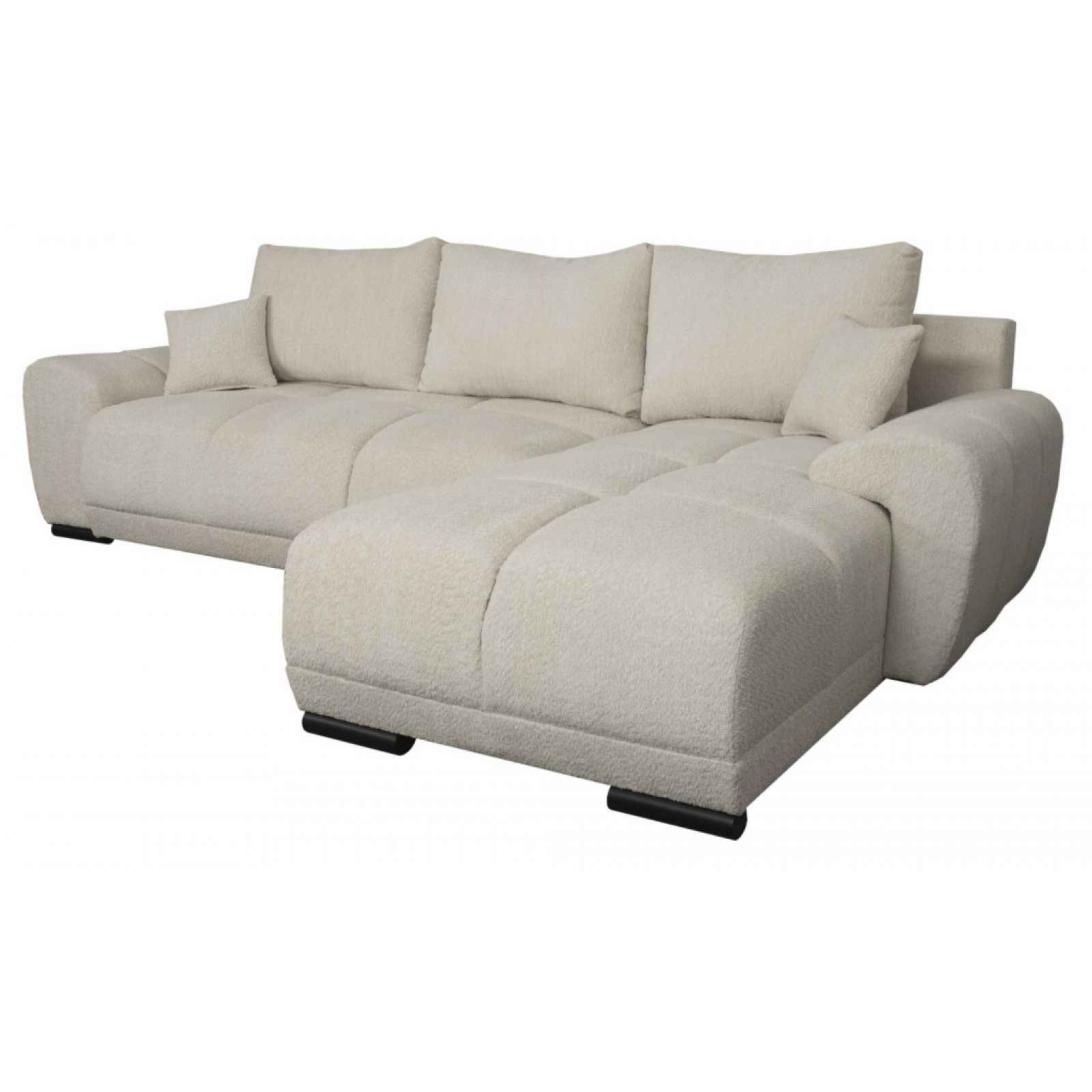 Stylová rohová sedačka v zaoblených tvarech má výrazné prošití a velké polštáře pro každodenní pohodlí. Moderní design doplňuje praktický prostor a rozklad. Stylová rohová sedačka v zaoblených tvarech má výrazné prošití a velké polštáře pro každodenní pohodlí. Moderní design doplňuje praktický úložný prostor pod sedákem, kam uschováte polštáře, deky, věci sezónní potřeby anebo třeba oblečení. Rozkládací funkce poslouží během chvil relaxace anebo pro příležitostné spaní. Pohodlné sezení doplňuje potahová látka buklé s delším strukturovaným vlasem v barvě světle béžová, která je příjemně měkká a vytváří útulnou atmosféru v obýváku. Velkou výhodou je to, že sedací soupravu lze univerzálně sestavit jako pravý anebo levý roh - snadno se tak přizpůsobí půdorysu vašeho obýváku. - konstrukce: dřevo, dřevotříska, překližka, kov - jádro: vlnovcové pružiny, polyuretanová pěna, čalounický flís - potah: látka Coral 65 – měkoučká látka buklé s delším strukturovaným vlasem, barva světle béžová (složení: 100% PES, otěruvzdornost: 45.000 cyklů) - včetně potažení zadní části (možné umístění i v prostoru) - 3 x velký opěrný polštář (snímatelný potah na zip, cca 74x48 cm) - 2 x malý polštář (snímatelný potah na zip, cca 32x32 cm) - rohový půdorys – univerzální montáž jako pravý nebo levý roh (umístění otomanu na pravou nebo levou stranu) - levá/pravá boční područka: zaoblený tvar - zaoblené tvary - elegantní moderní design - sedák: středně měkký - opěrák: opěrné polštáře, komfort + opora - výška sedu: 46 cm - hloubka sedu s polštáři: 59 cm/bez polštářů: 89 cm - celková výška bez polštářů: 73 cm/s polštáři: cca 89 cm - nohy: plast, černé, výška 5 cm - funkce rozkladu na příležitostné lůžko: plocha 132×224 cm (sklápěcí typ rozkladu – příležitostné lůžko snadno vznikne po vysunutí sedáku vpřed a sklopení opěráku) - úložný prostor (pod sedákem, rozměry cca 148x24x61 cm) - dodáváno v částečném demontu