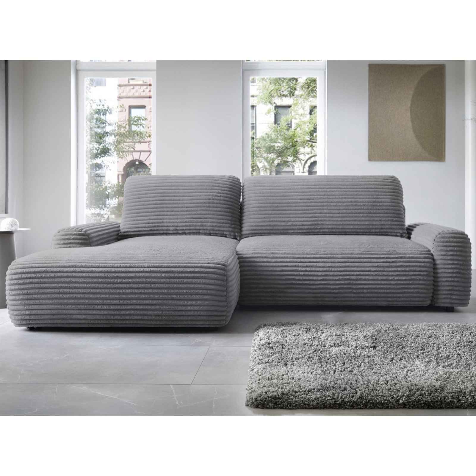Elegantní rohová sedačka se zaoblenými područkami a velkými polštáři nabízí příjemný komfort sezení, který umocňuje měkkoučká látka s proužkovanou strukturou. Elegantní rohová sedačka se zaoblenými područkami a velkými polštáři nabízí příjemný komfort sezení, který umocňuje útulná měkkoučká potahová látka se zajímavou proužkovanou strukturou v odstínu dýmově šedá. Rohová sedačka tvoří se svým otomanem levý roh. Kromě praktického úložného prostoru můžete využít i funkci rozkladu pro příležitostné spaní anebo relaxaci. Sedačka se svými rozměry pasuje do menšího i většího obýváku. - konstrukce: dřevo, dřevotříska, překližka, kov - jádro: vlnovcové pružiny, polyuretanová pěna, čalounický flís - potah korpus/polštáře: látka Ambience 19 – měkoučká látka s delším vlasem a proužkovanou strukturou, barva dýmově šedá (složení: 100% polyester, otěruvzdornost: 100.000 cyklů) - včetně potažení zadní části (možné umístění i v prostoru) - 2 x velký opěrný polštář (snímatelný potah na zip, rozměry cca 118x45 cm/88×45 cm) - rohový půdorys – levý roh (otoman umístěn vlevo) - levá/pravá boční područka (zaoblený tvar, výška 52 cm) - šířka otomanu: 120 cm - sedák: středně měkký - opěrák: velké opěrné polštáře, středně měkké - výška sedu: 42 cm - hloubka sedu s polštáři: -- cm/bez polštářů: -- cm - celková výška bez polštářů: 68 cm/s polštáři: cca 85 cm - nohy: kluzáky, plast, černé - funkce rozkladu na příležitostné lůžko: plocha 134x210 cm (sklápěcí typ rozkladu – příležitostné lůžko snadno vznikne po vysunutí sedáku vpřed a sklopení opěráku) - úložný prostor (pod sedákem) - elegantní moderní styl - dodáváno v částečném demontu