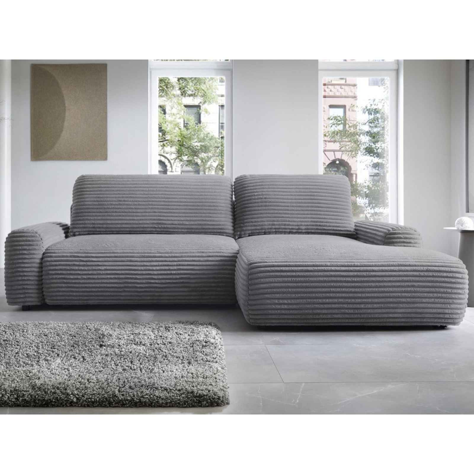 Elegantní rohová sedačka se zaoblenými područkami a velkými polštáři nabízí příjemný komfort sezení, který umocňuje měkkoučká látka s proužkovanou strukturou. Elegantní rohová sedačka se zaoblenými područkami a velkými polštáři nabízí příjemný komfort sezení, který umocňuje útulná měkkoučká potahová látka se zajímavou proužkovanou strukturou v odstínu dýmově šedá. Rohová sedačka tvoří se svým otomanem pravý roh. Kromě praktického úložného prostoru můžete využít i funkci rozkladu pro příležitostné spaní anebo relaxaci. Sedačka se svými rozměry pasuje do menšího i většího obýváku. - konstrukce: dřevo, dřevotříska, překližka, kov - jádro: vlnovcové pružiny, polyuretanová pěna, čalounický flís - potah korpus/polštáře: látka Ambience 19 – měkoučká látka s delším vlasem a proužkovanou strukturou, barva dýmově šedá (složení: 100% polyester, otěruvzdornost: 100.000 cyklů) - včetně potažení zadní části (možné umístění i v prostoru) - 2 x velký opěrný polštář (snímatelný potah na zip, rozměry cca 118x45 cm/88×45 cm) - rohový půdorys – pravý roh (otoman umístěn vpravo) - levá/pravá boční područka (zaoblený tvar, výška 52 cm) - šířka otomanu: 120 cm - sedák: středně měkký - opěrák: velké opěrné polštáře, středně měkké - výška sedu: 42 cm - hloubka sedu s polštáři: -- cm/bez polštářů: -- cm - celková výška bez polštářů: 68 cm/s polštáři: cca 85 cm - nohy: kluzáky, plast, černé - funkce rozkladu na příležitostné lůžko: plocha 134x210 cm (sklápěcí typ rozkladu – příležitostné lůžko snadno vznikne po vysunutí sedáku vpřed a sklopení opěráku) - úložný prostor (pod sedákem) - elegantní moderní styl - dodáváno v částečném demontu