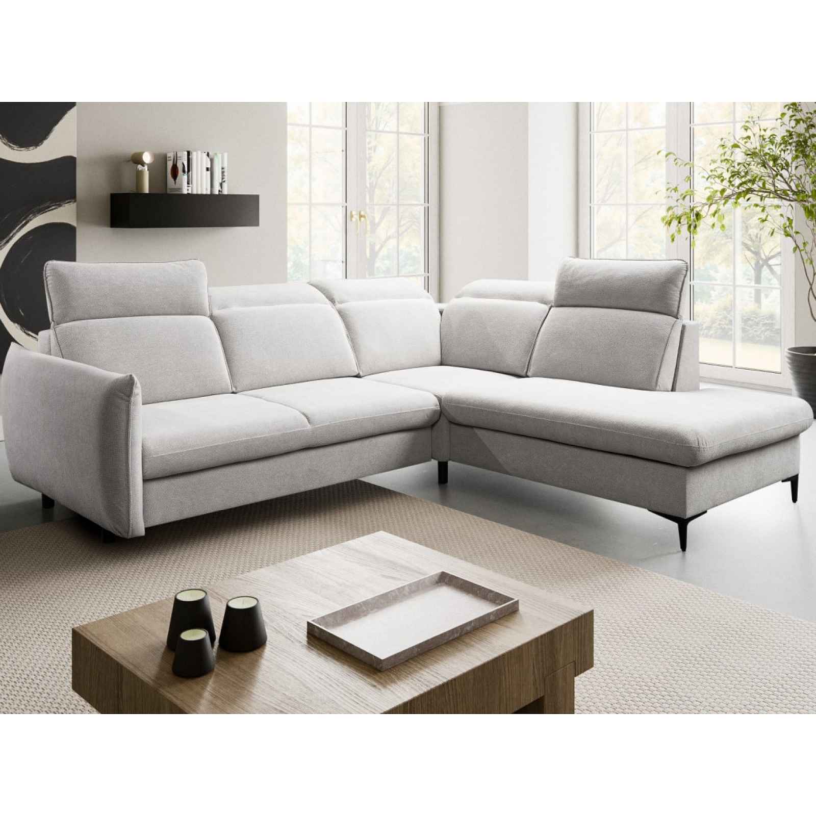 Trendová rohová sedačka s funkcí rozkladu a úložným prostorem má komfortní sezení doplněno polohovatelnými opěrkami, který si můžete libovolně nastavovat. Trendová rohová sedačka s praktickou funkcí rozkladu a úložným prostorem pod otomanem. Komfortní sezení je doplněno polohovatelnými opěrkami, který si můžete libovolně nastavovat podle aktuální potřeby. Moderní členitý design sedačky připomíná na pohled polštáře, které přímo lákají k pohodlnému posezení. Díky vyšší podnoži můžete během úklidu využít například i robotický vysavač. Tato varianta sedačky s otomanem vpravo tvoří pravý roh a je očalouněna jemně strukturovanou látkou v barvě světle šedá, která je příjemně měkká a zároveň odolná. - konstrukce: dřevo, dřevotříska, překližka, kov - jádro: vlnovcové pružiny, polyuretanové pěny, čalounický flís - potah: látka Curio 84 – jemně strukturovaná, příjemně měkká a odolná látka, barva světle šedá (složení: 100% polyester, otěruvzdornost: 60.000 cyklů, speciální vlastnosti: zvýšená voděodolnost – tkanina je potažena speciální ochrannou vrstvou, která vytváří hydrofobní povlak, který chrání před rychlým přechodem tekutin – to zabraňuje okamžité absorpci vody skrz tkaninu, čímž se kapalina kondenzuje na povrchu materiálu, díky tomu máte čas použít měkký hadřík nebo papírový ručník k jemnému odfiltrování rozlité kapaliny) - včetně potažení zadní části (možné umístění i v prostoru) - členitá optika připomínající polštáře - rohový půdorys – pravý roh (otoman umístěn vpravo) - levá boční područka (šířka 15 cm) - sedák: komfortně měkký - opěrák: středně měkký, pohodlný sklon - 5 x široká opěrka zad v horní části opěráku – s polohovatelnou funkcí (nastavení libovolné polohy, opěrky zajistí komfortní opření horní části zad/hlavy a díky možnosti nastavení jejich sklonu si tak můžete přizpůsobit styl sezení podle Vaší individuální potřeby) - celková výška – dle polohy zádové opěrky: 85-99 cm - výška sedu: 44 cm - hloubka sedu: 56 cm - výška opěradla - dle polohy zádové opěrky: cca 45-60 cm - přední nohy: kov, černé, výška 11,5 cm/zadní nohy: plast, černé - funkce rozkladu na příležitostné lůžko: plocha 123x200 cm (výsuvný typ rozkladu, konstrukce kov/dřevo, na kolečkách pro snazší manipulaci, látkové madlo, plocha lůžka potažena látkou) - úložný prostor (pod otomanem, vyklápěcí kovová konstrukce) - moderní trendy design - dodáváno v částečném demontu