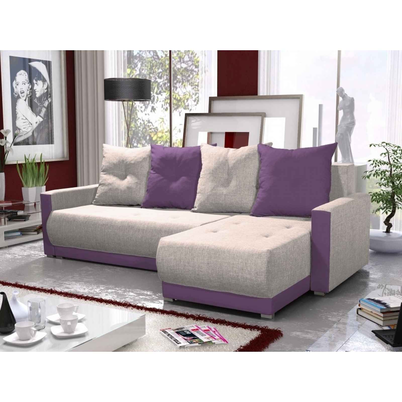 Rozkládací rohová sedačka Potahová látka: sawana 01 (krémová)/sawana 70 (fialová) Zadní část sedačky je potažená látkou, je tedy možné postavit sedačku kdekoliv v prostoru. Rám z masivního dřeva s prvky dřevotřísky. Vlnité pružiny, vysoce elastická pěna. Sedačka je univerzální = roh lze smontovat na pravý i levý! Rozměry (dxšxv): 220 x 146 x 67 cm, výška sedu 37 cm Hloubka sedu: - s polštáři 69 cm - bez polštářů 84 cm Hloubka sedu u ramena sedačky: - s polštáři 115 cm - bez polštářů 131 cm Prostor pro spaní: 200 x 135 cm V ceně jsou čtyři polštáře (51 x 51 cm), zapínání na zip. Úložný prostor. Dodání v demontu. Záruka 24 měsíců.