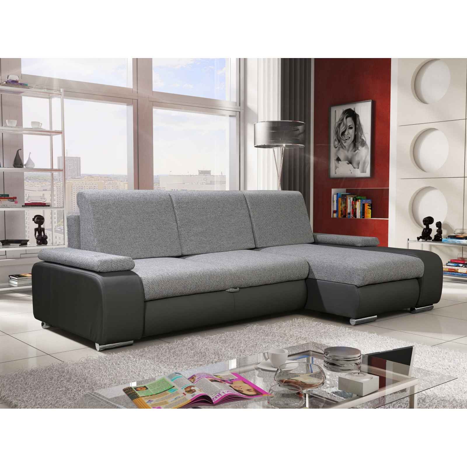 Rozkládací rohová sedačka Sedačka je univerzální = roh lze smontovat na pravý i levý! Potahová látka: Inari 91 = světle šedá látka/ Madryt 195 = tmavě šedá ekokůže Obrázek rozložené sedačky je ilustrativní (jiná barva)! Materiál: pružiny bonell, polyuretanová pěna T25 Rozměry (dxšxv): 255 x 144 x 90 cm. Výška bez polštářů: 75 cm Výška sedu: 42 cm Hloubka sedu: 55 cm k polštářům, 80 cm bez polštářů Prostor pro spaní: 203 x 140 cm Rozměry úložného prostoru: 130 x 63 cm + 131 x 61 cm Nohy chromované. Dodání v demontu. Záruka 24 měsíců.