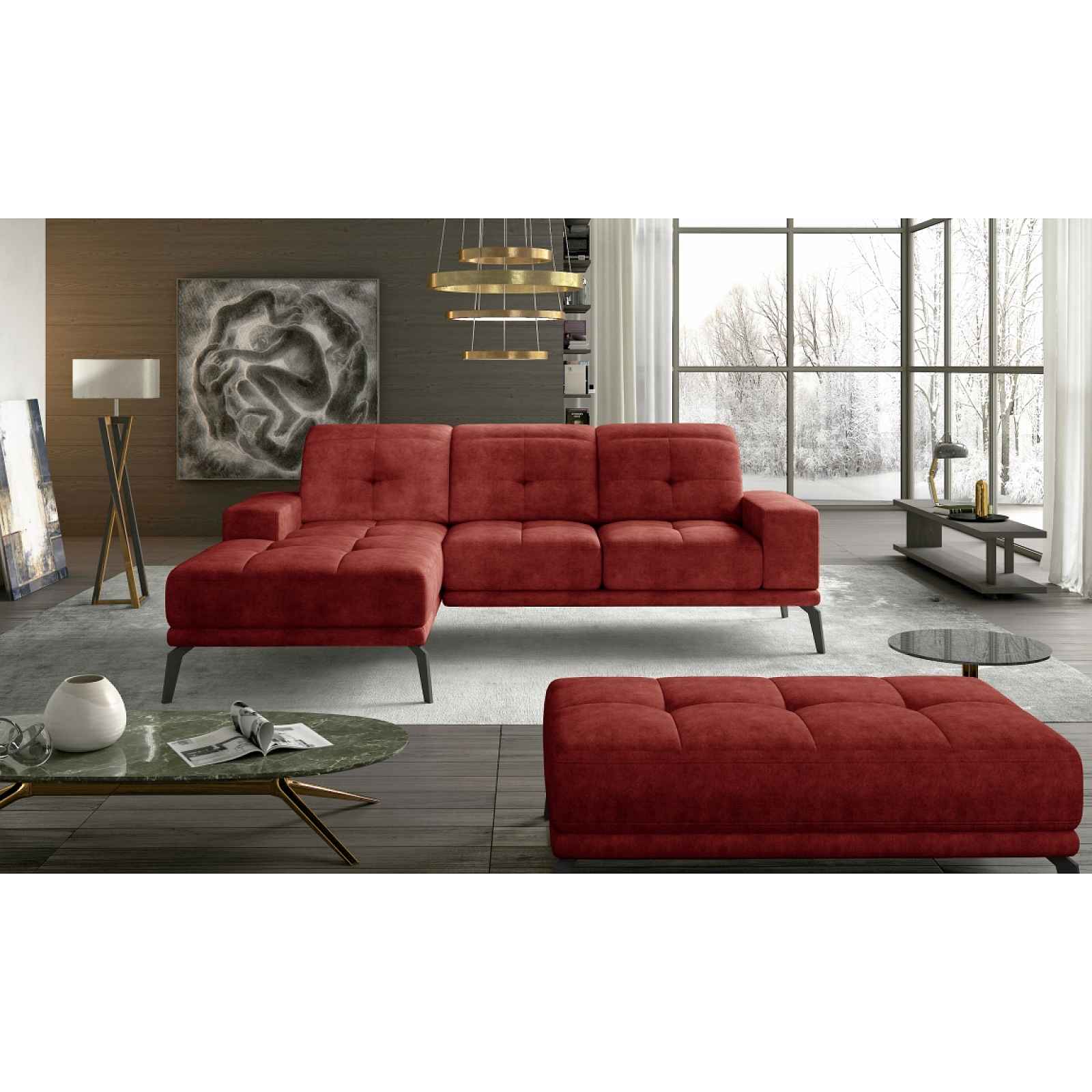 Rohová sedačka Potahová látka: Dora 63 = červená látkaProvedení: LEVÉ Sedačka má regulovatelné opěrky hlavy a opěrky zad. Sedačka je vhodná do prostoru, má čalouněná záda stejnou potahovou látkou. Rozměr (šxvxh): 265 x 98/77 x 175 cmPři zakoupení taburetu je možno vytvořit prostor na spaní (šxh): 215 x 140 cm -výška sedu: 45 cm-hloubka sedu: 53 cm-výška nožek: 20 cm Materiá: pěna HR + T21/T25 Dodáváno v demontu.