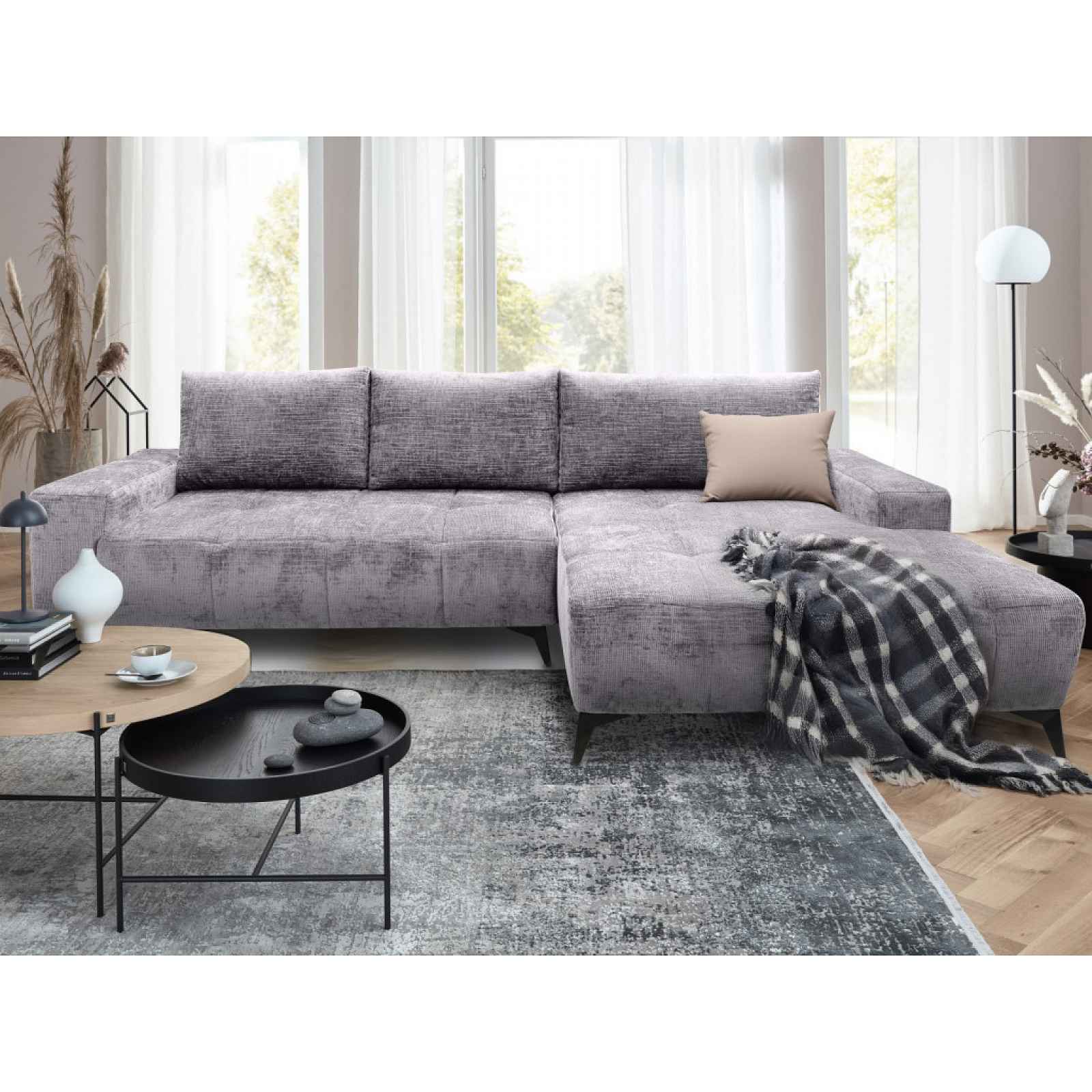 Moderní rohová sedačka je komfortně měkká a prostorná. Sedačka s otomanem tvoří pravý roh a je očalouněna měkkou strukturovanou látkou v barvě holubí šedá. Moderní rohová sedačka je prostorná a má komfortně měkké sezení. Sedačka s otomanem tvoří pravý roh a je očalouněna měkkou strukturovanou látkou se sametově lesklým efektem v barvě holubí šedá - atraktivní potahová látka navíc působí luxusně. Zaujme stylovým proševem sedáku i bočních područek. Černé kovové nohy v moderním designu usnadní údržbu podlahy pod sedačkou. Rohová sedací souprava je vybavena rozkládací funkcí a praktickým úložným prostorem pod sedákem, kam můžete ukládat například deky nebo věci sezónní potřeby. - konstrukce: dřevo, dřevotříska, překližka, kov - jádro: vlnovcové pružiny, polyuretanová pěna, čalounický flís - potah: látka Astra 18 – měkká strukturovaná žinilková látka se sametově lesklým efektem, barva holubí šedá (složení: 100% polyester, otěruvzdornost: 90.000 cyklů) - včetně potažení zadní části (možné umístění i v prostoru) - výrazný prošev potahu sedáku/područek - 3 x velký opěrný polštář (snímatelný potah na zip, cca 70x45 cm/95x45 cm) - rohový půdorys – pravý roh (otoman umístěn vpravo) - šířka otomanu: 125 cm - levá/pravá boční područka (šířka cca 25 cm, výška cca 55 cm) - sedák: komfortně měkký, prostorný - opěrák: opěrné polštáře, hustá výplň = opora - výška sedu: 43 cm - hloubka sedu s polštáři: 65 cm/bez polštářů: 85 cm - celková výška bez polštářů: 73 cm/s polštáři: cca 85 cm - nohy: kov, černý lak, výška 13 cm (snadná údržba podlahy, možnost využití robotického vysavače) - funkce rozkladu na příležitostné lůžko: plocha 132x236 cm (sklápěcí typ rozkladu – příležitostné lůžko snadno vznikne po vysunutí sedáku vpřed a sklopení opěráku) - úložný prostor (pod sedákem) - moderní styl - dodáváno v částečném demontu