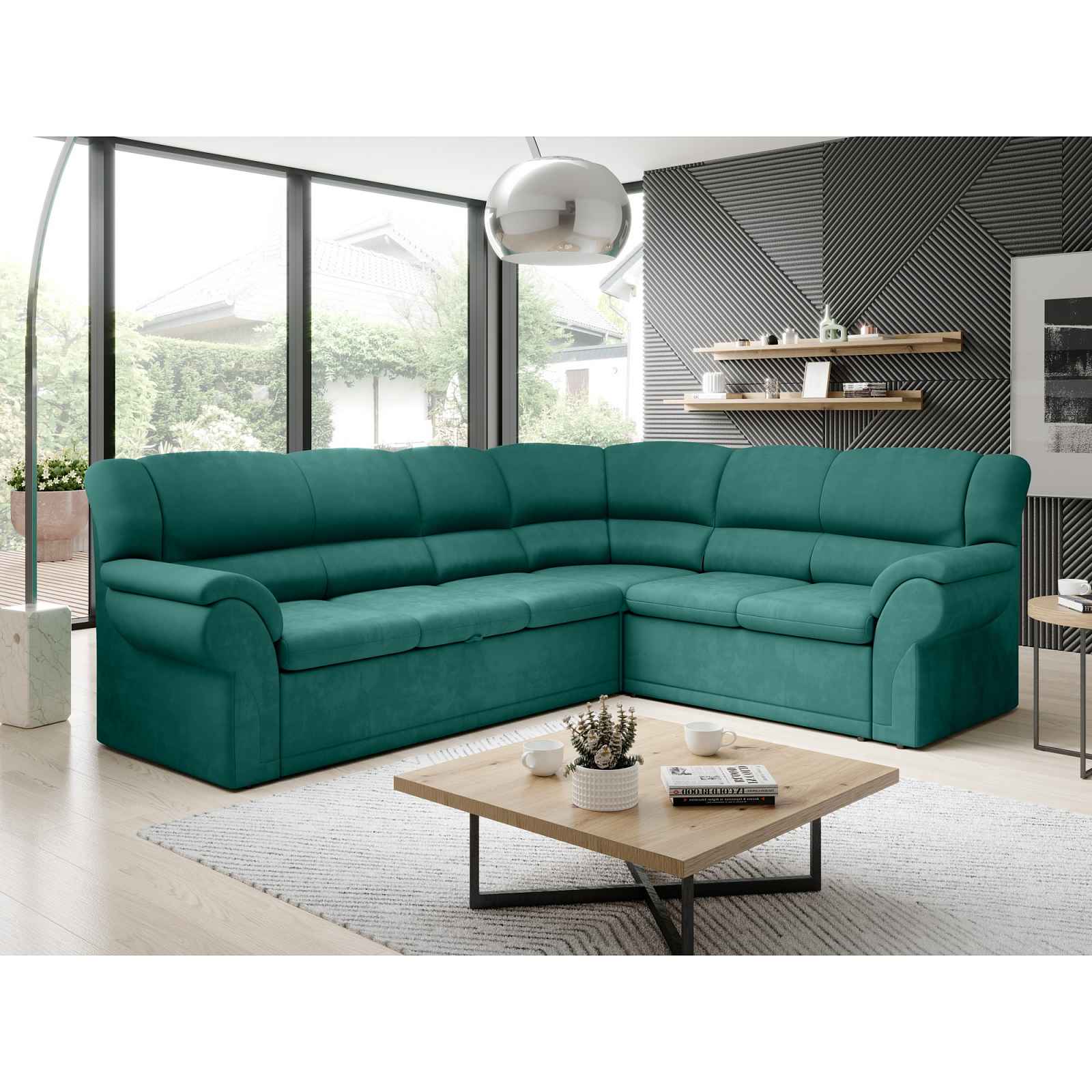 Rozkládací rohová sedačka Provedení: pravé Potahová látka: monolith 37 = zelená látka Materiál: vlnité pružiny, polyuretanová pěna T30Nohy plastové. Rozměry (dxšxv): 270 x 220 x 93 cm Výška sedu: 45 cm Hloubka sedu: 50 cm Prostor pro spaní: 205 x 120 cm Rozměry úložného prostoru: 91x69 cm Dodání v demontu.