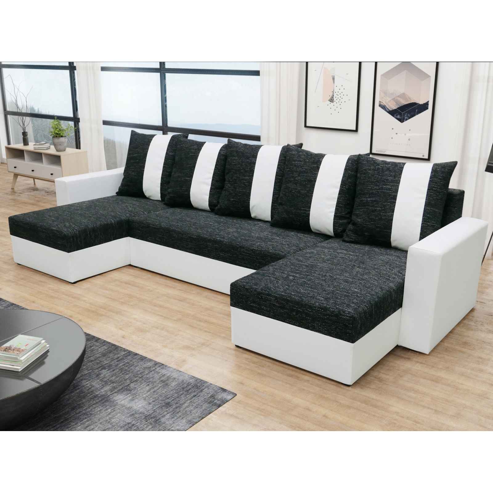 Rohová sedačka U Potahová látka: kornet 10 = černá látka/D511 = bílá ekokůže Zadní část sedačky je potažená látkou, je tedy možné postavit sedačku kdekoliv v prostoru. Rozměry (šxhxv): 295 x 133 x 69 cm Výška sedu: 40 cm Prostor pro příležitostné spaní: 263 x 133 cm Materiál: vlnité pružiny + pěna T30, plastové nožky V ceně je 5 polštářů – zapínání na zip. Sedačka má 1 úložný prostor. Záruka 24 měsíců.