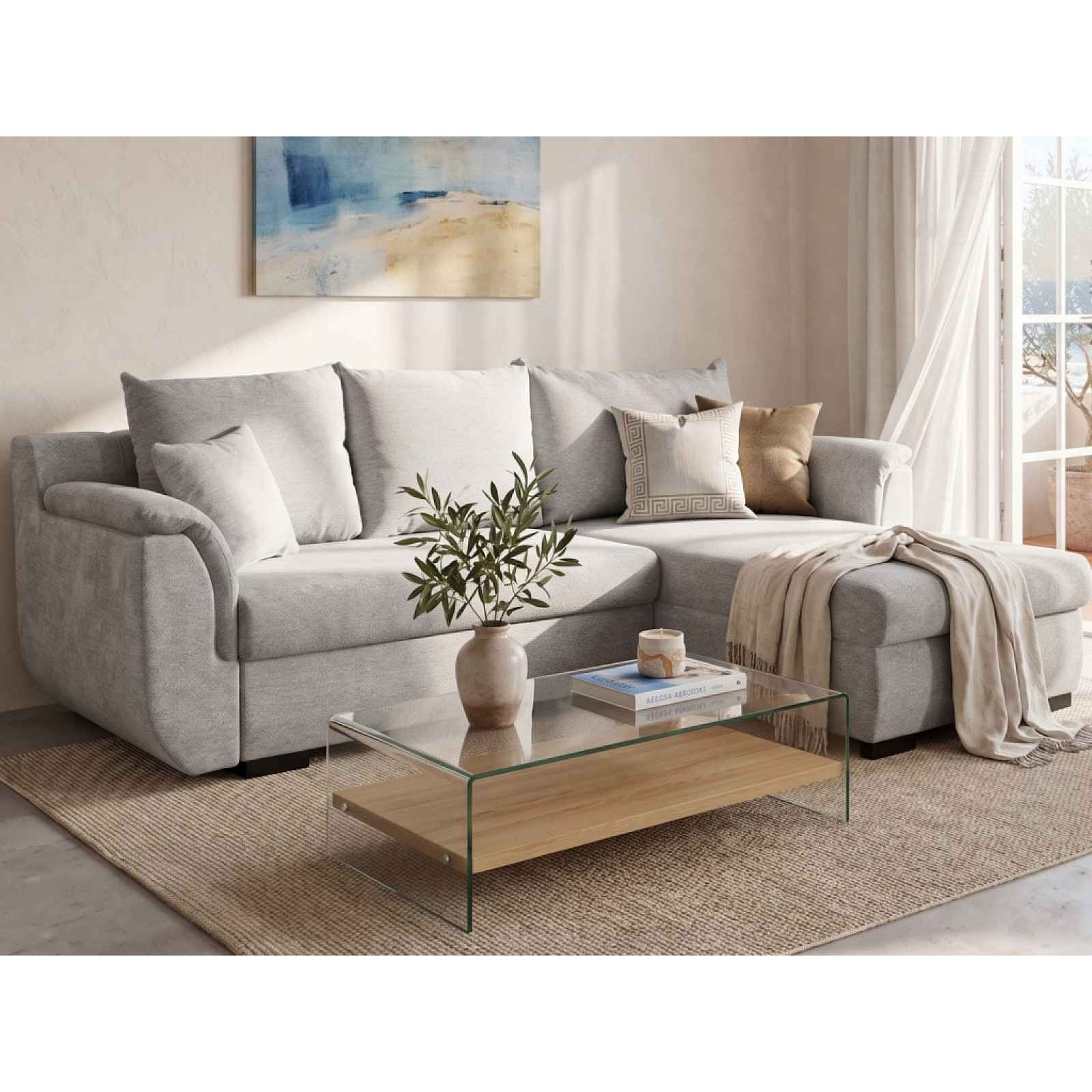Elegantní rohová sedačka nabízí příjemné sezení, praktický úložný prostor i rozkládací funkci, kterou využijete během relaxace anebo příležitostného spaní. Elegantní rohová sedačka nabízí příjemné sezení, velké polštáře a komfortně měkké zaoblené područky. Praktický úložný prostor pod sedákem využijete například pro uschování deky, polštářů nebo sezónních věcí. Oceníte i rozkládací funkci, kterou využijete během relaxace anebo pro příležitostné spaní. Sedačka je očalouněna měkkoučkou žinylkovou látkou v barvě světle šedá. Tato rohová sedací souprava lze univerzálně sestavit jako pravý anebo levý roh. Rozměrově pasuje také do menšího prostoru, kde vytvoří příjemně útulné zákoutí pro chvíle pohody. - konstrukce: dřevo, dřevotříska, překližka, kov - jádro: vlnovcové pružiny, polyuretanová pěna, čalounický flís - potah korpus/polštáře: látka Vibe 85 – příjemně měkkoučká žinylková látka, barva světle šedá (složení: 100% polyester, otěruvzdornost: 30.000 cyklů) - včetně potažení zadní části (možné umístění i v prostoru) - 3 x velký opěrný polštář (snímatelný potah na zip, cca 85x52 cm/58x52 cm) - 2 x malý polštářek (snímatelný potah na zip, cca 38x38 cm) - rohový půdorys – univerzální montáž jako pravý nebo levý roh (umístění otomanu na pravou nebo levou stranu) - levá/pravá boční područka: zaoblený tvar, měkké vypolstrování - zaoblené tvary - sedák: středně měkký - opěrák: opěrné polštáře, komfort + opora - výška sedu: 42 cm - hloubka sedu s polštáři: 50 cm/bez polštářů: 77 cm - celková výška bez polštářů: 74 cm/s polštáři: cca 90 cm - nohy: plast, černé, výška 4,5 cm - funkce rozkladu na příležitostné lůžko: plocha 123x190 cm (sklápěcí typ rozkladu – příležitostné lůžko snadno vznikne po vysunutí sedáku vpřed a sklopení opěráku) - úložný prostor (pod sedákem, rozměry cca 107x24,5x54 cm) - dodáváno v částečném demontu