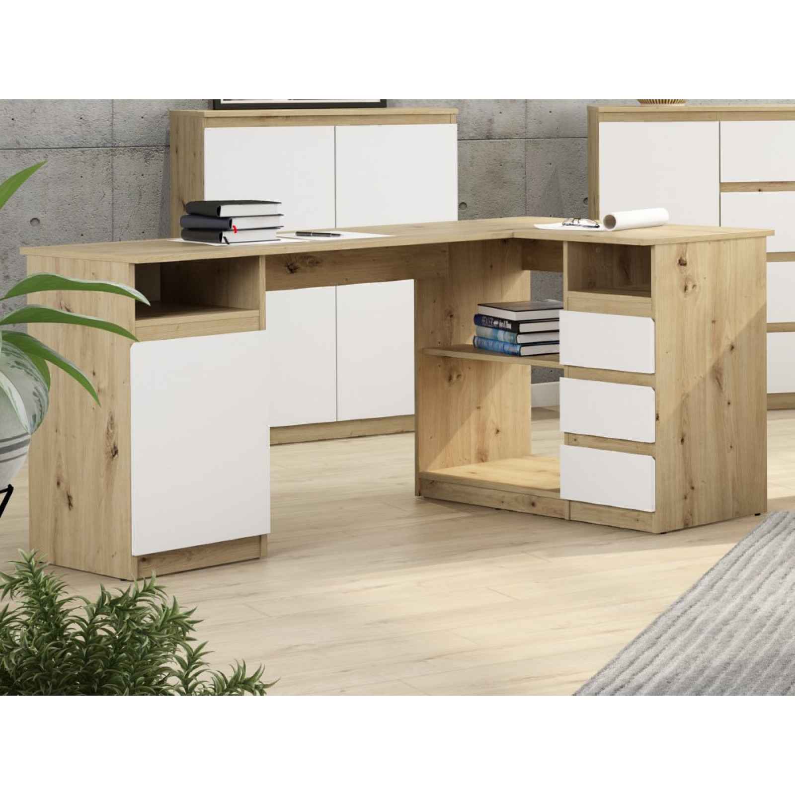Rohový psací stůl v dekoru dub artisan/bílá nabízí praktické úložné prostory z obou stran, účelnost a čisté linie tvarů, které se hodí do každého interieru. - materiál: dřevotříska 16 mm, kov, plast - dekor korpus: dub artisan - dekor přední plochy: bílá mat - úchyt: bezúchytové otevírání horní hranou - nožky: přízemní minikluzáky - rohová psací plocha: 150 cm/50 cm x 100 cm/45 cm - celkové rozměry: 150/100×75×50/45 cm - 1 x levá otevřená přihrádka (31,5×13×41,5 cm) - 1 x levé dveře (úložný prostor, 1 x police) - 2 x pravá velká otevřená přihrádka (60×32×36 cm) - 1 x pravá malá otevřená přihrádka (31,5×13×36,5 cm) - 3 x zásuvka - volná šířka pod stolem: 74 cm - stabilní konstrukce - prostorný - univerzální do každého interieru - dodáváno v demontu